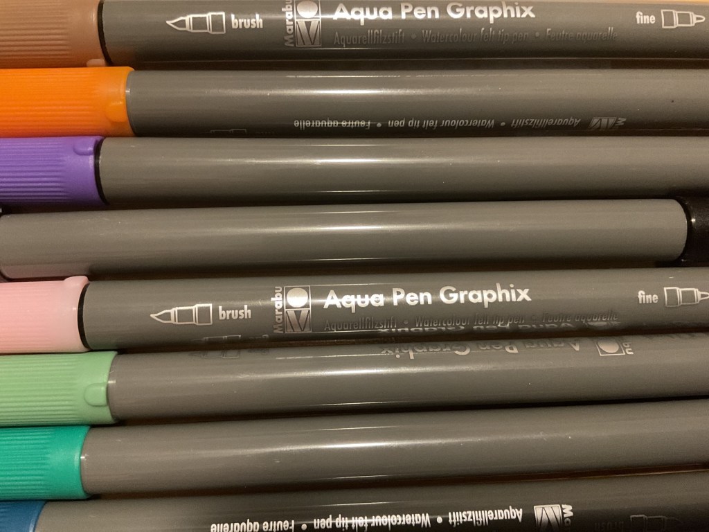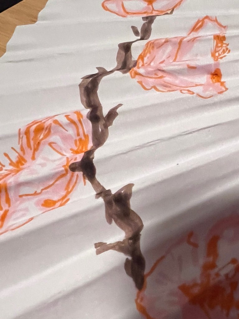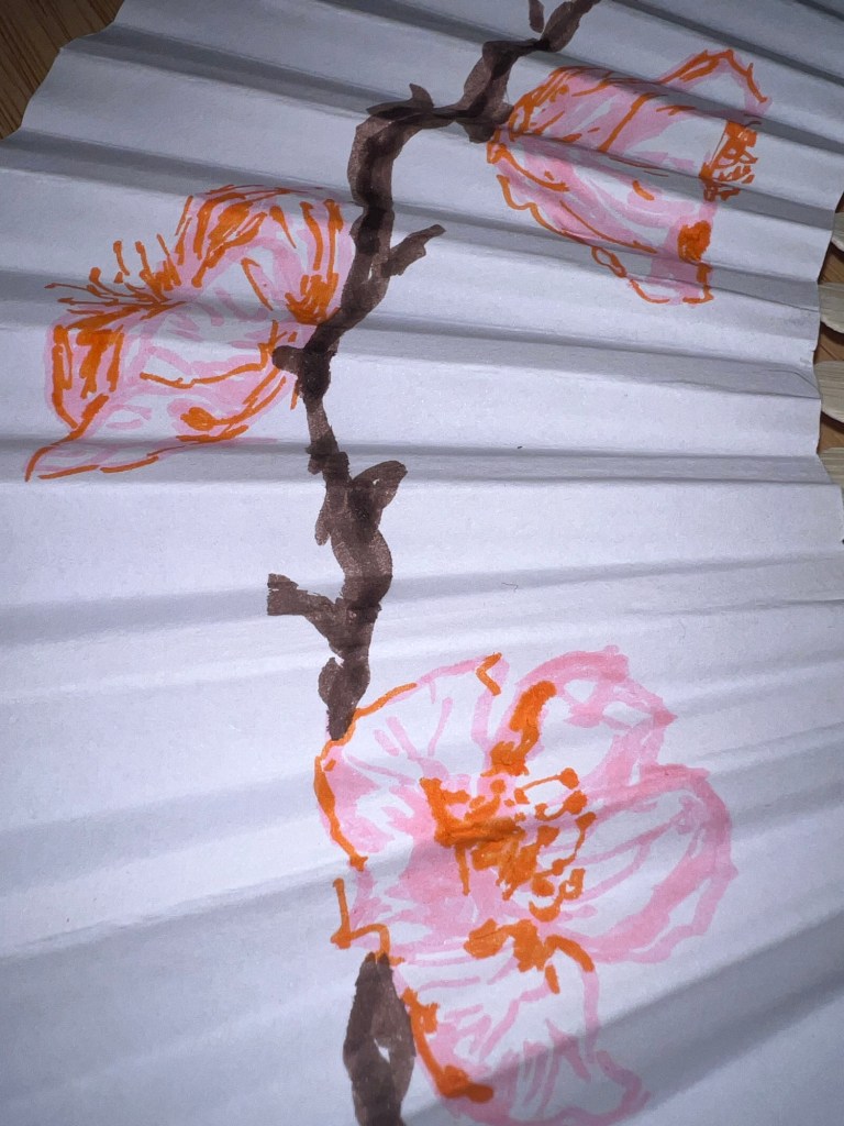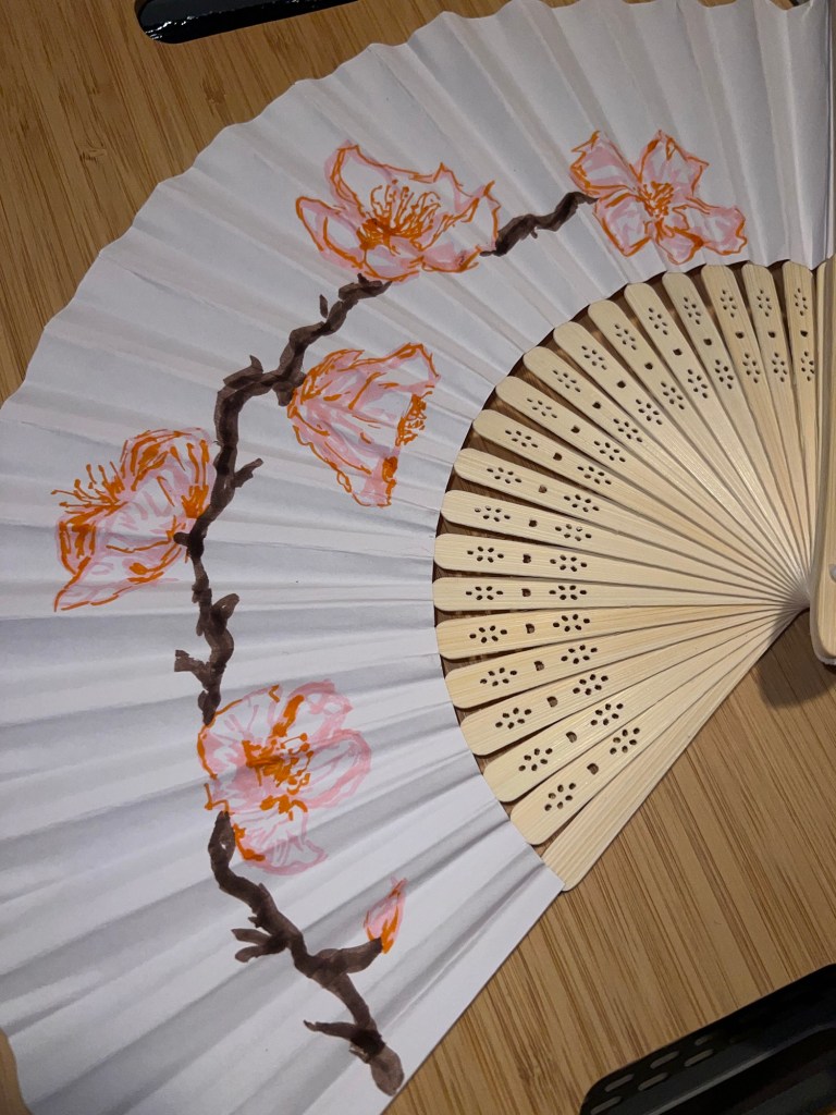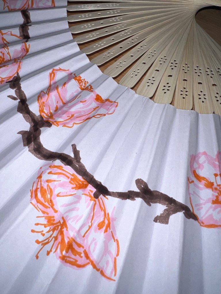 Today was the last day of Christmas break for my kids and it was quite chaotic in my house. I took a moment for meditation and that inspired me to incorporate cherry blossoms into todays art practice. I had bought this pack of paper fans last halloween to use in my daughter’s costume and threw the rest in with my art supplies. The seemed an appropriate canvas for my cherry blossoms. Since the paper of these fans was quite cheap I didn’t want to use water color, so I pulled out my Aqua Pen Graphix set. I did tear through the thin paper in a couple spots, but for the most part the worked well.