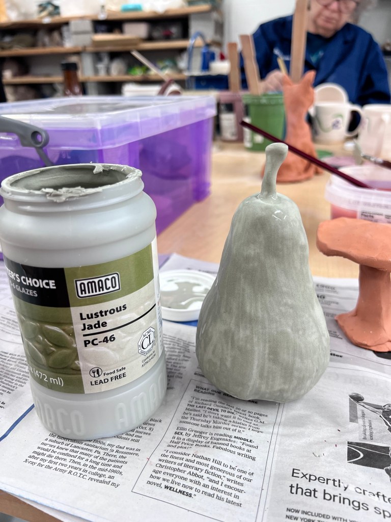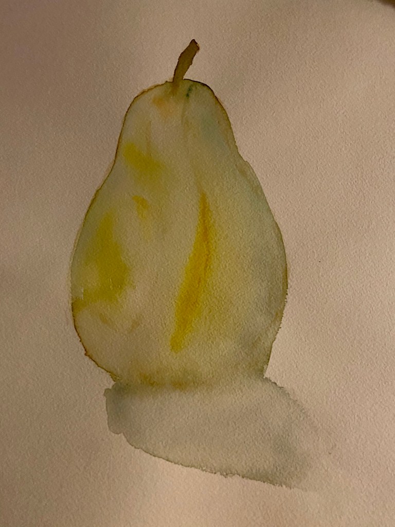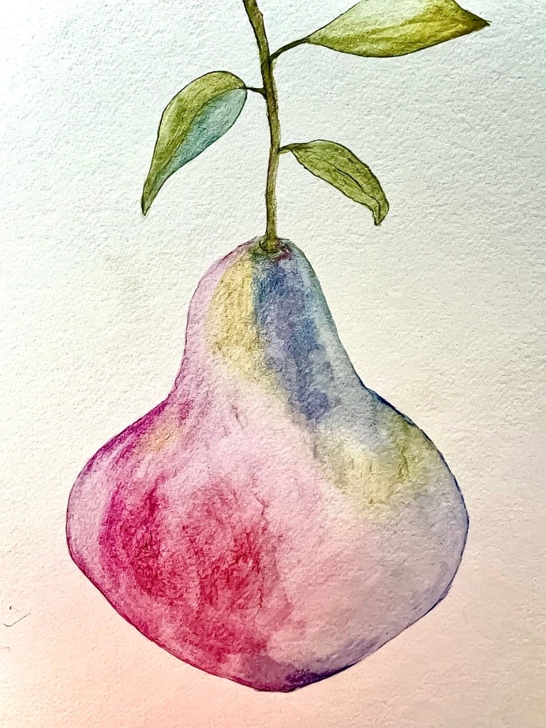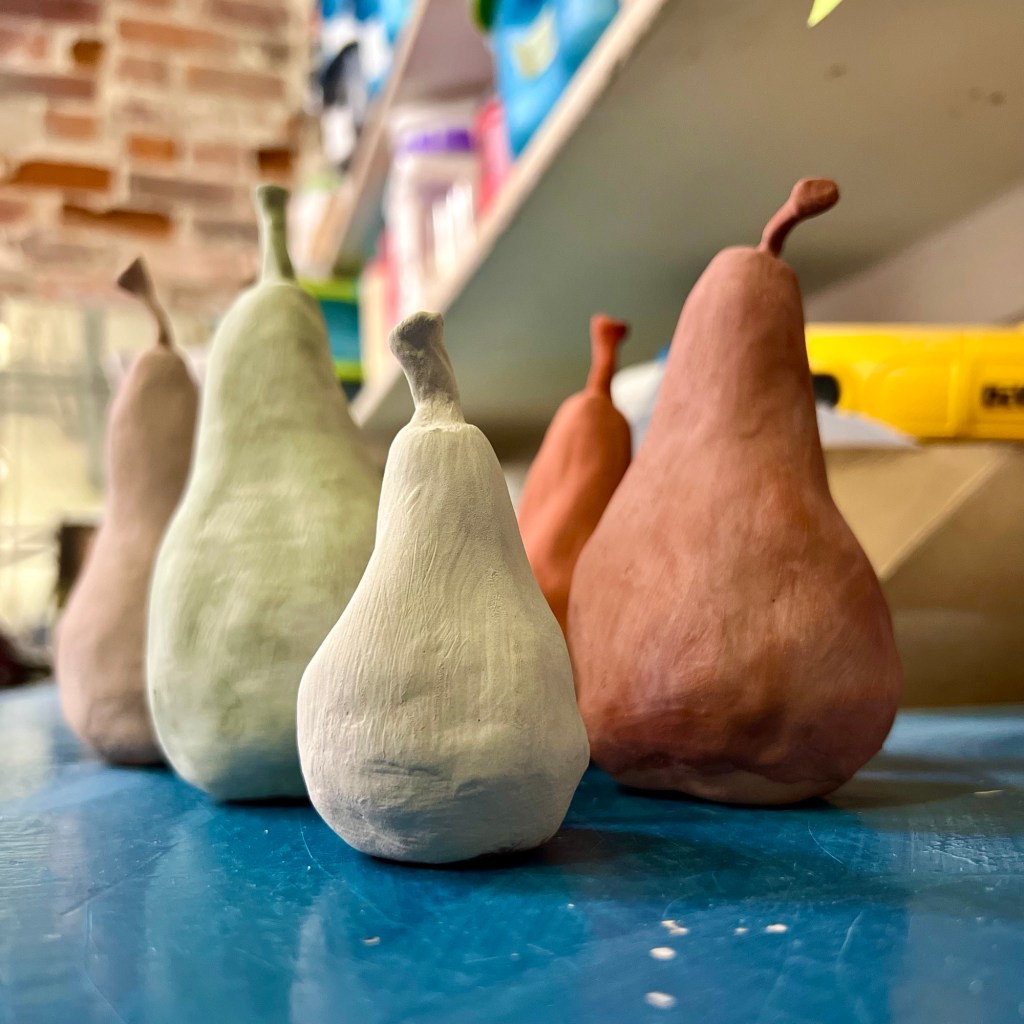 Some days when I feel a little stuck or uninspired, I go to my old standby of Pears. I love their shape, color, texture, taste… I have drawn, painted and sculpted various forms of pears, therefore I seldom require a reference, so it is a great standby for me when I’m feeling down or unmotivated. I can draw them on whatever paper I have on hand and utilize whichever media is handy. I’ve used my kids’ Crayola markers in bold colors, sidewalk chalk on the sun warmed driveway, watercolor, oil pastels, acrylics and clay.