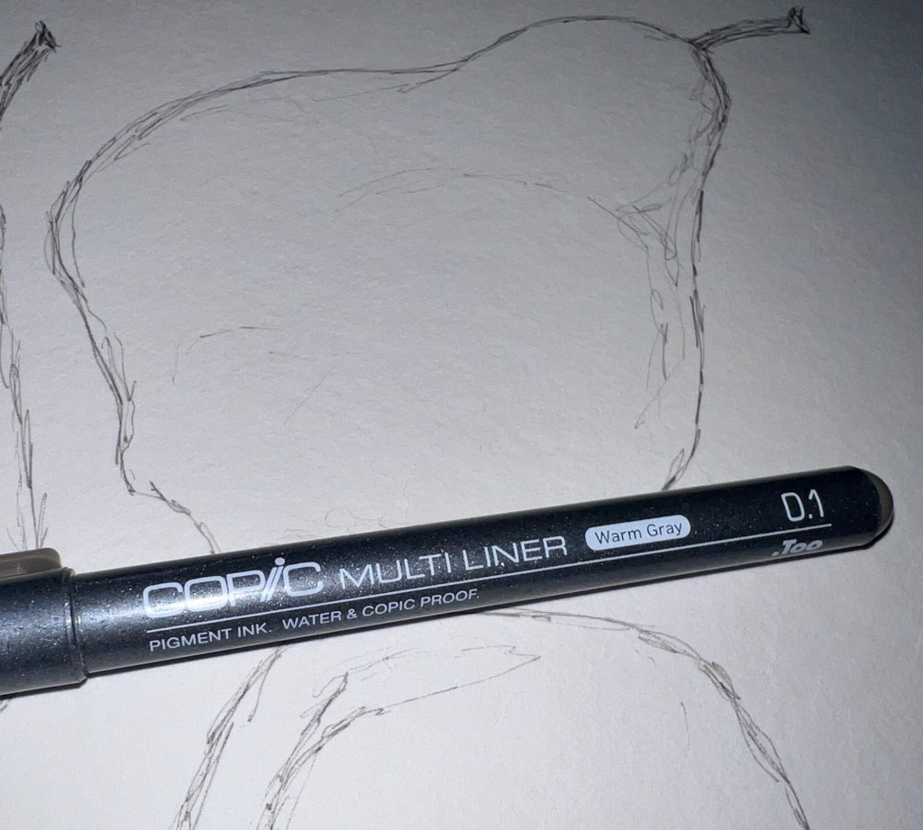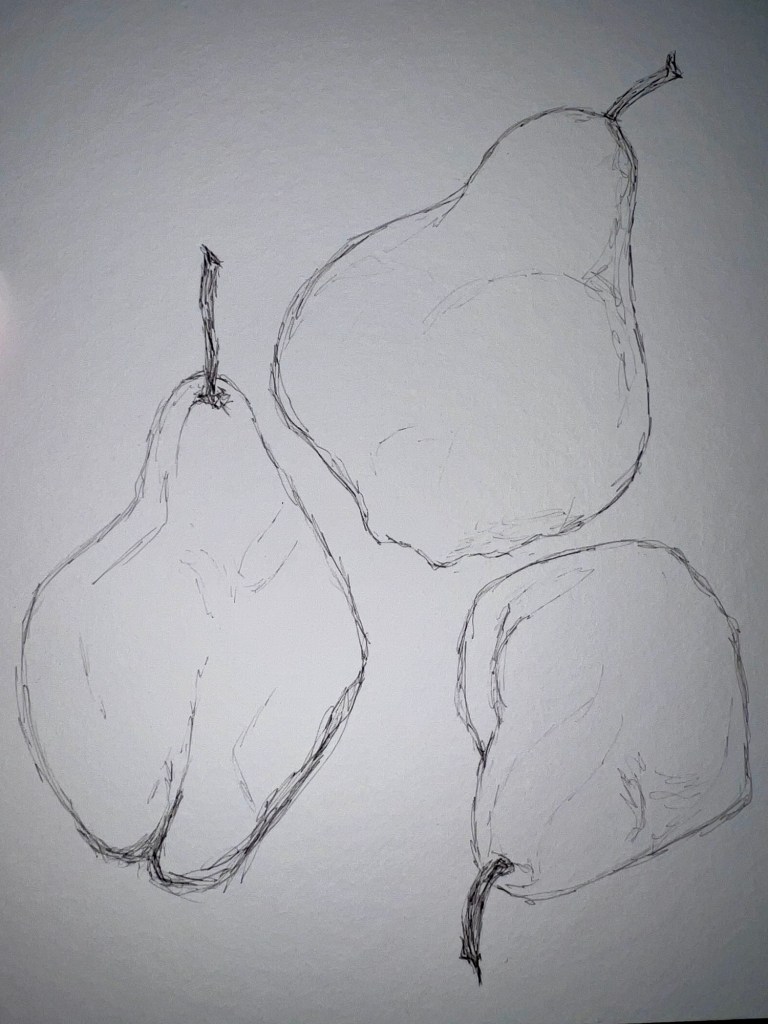 Today was filled to the brim and were it not for my goal of creating art everyday, I likely would not have squeezed in some sketch time. It only took a few minutes to whip up this quick sketch of a trio of pears. I like how it turned out so since I used a Copic Multiliner on watercolor paper, I may go back and apply a watercolor wash at a later time.