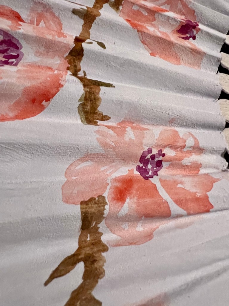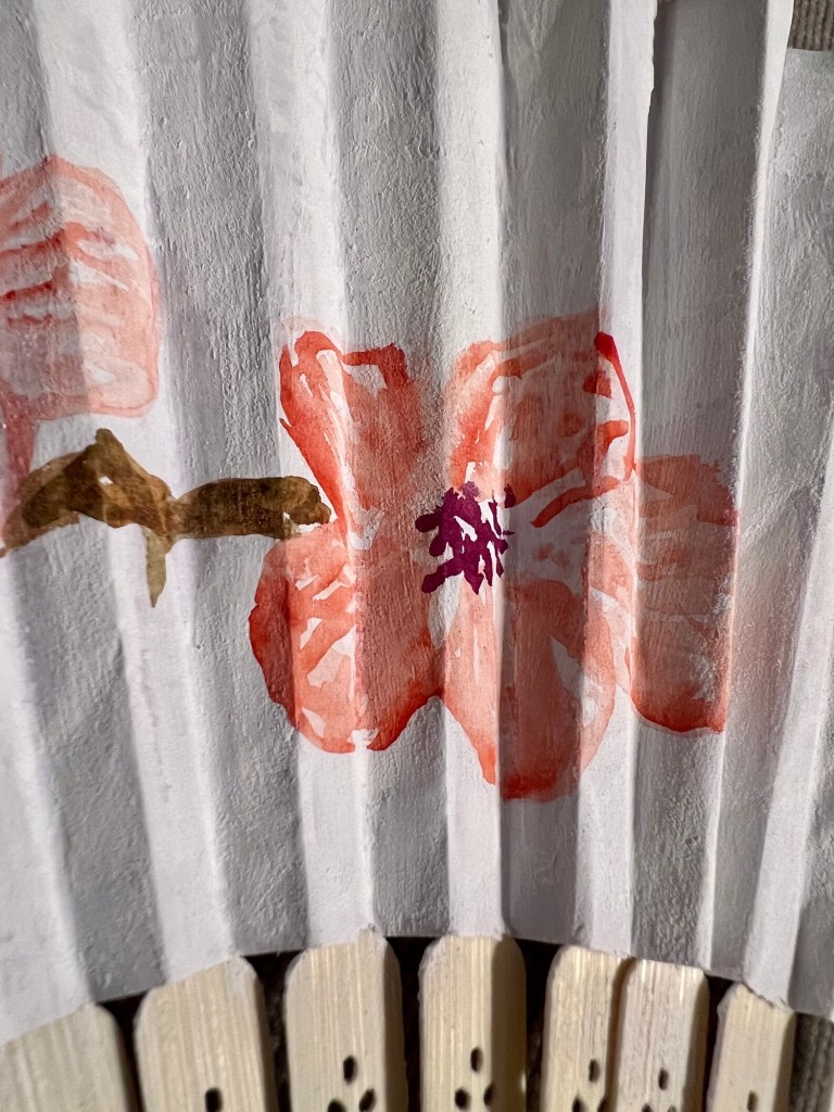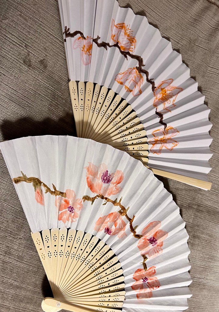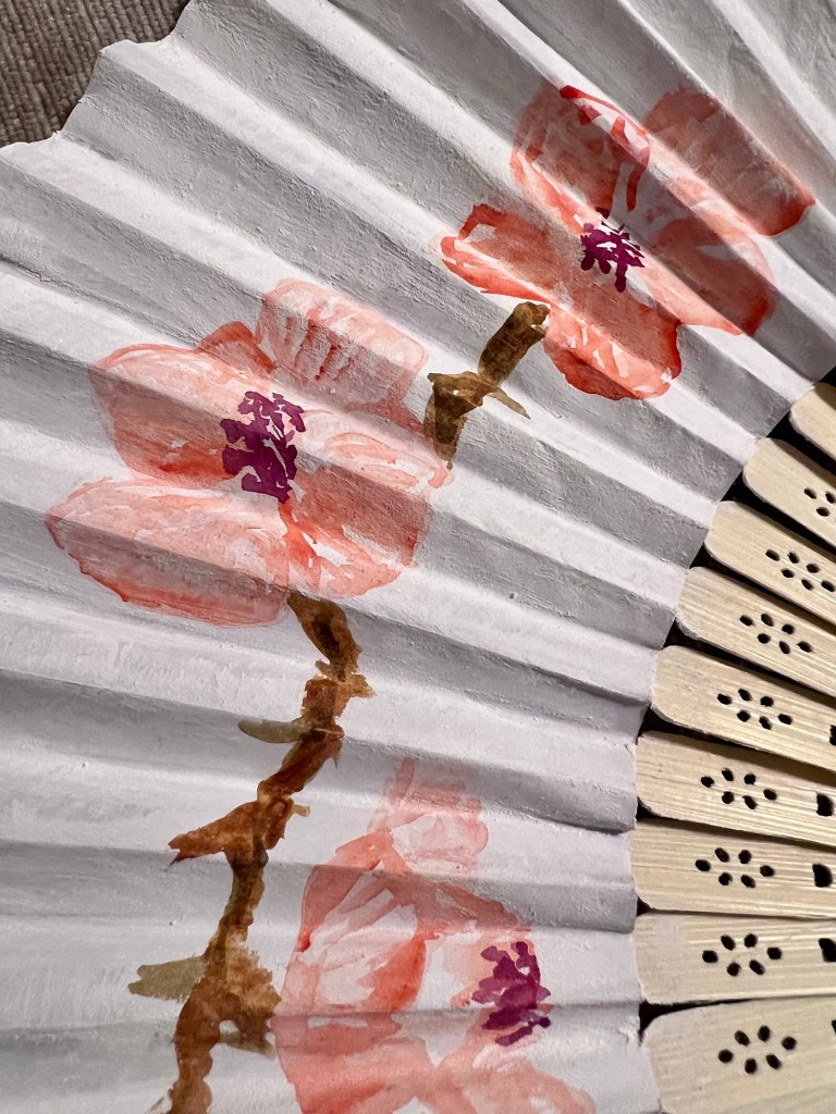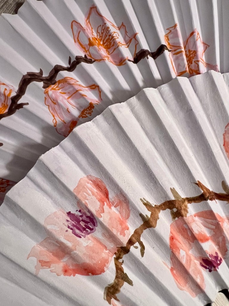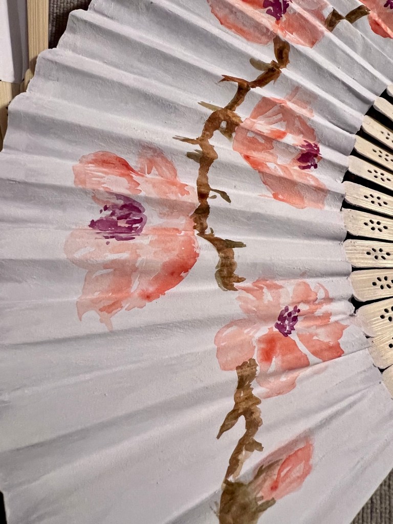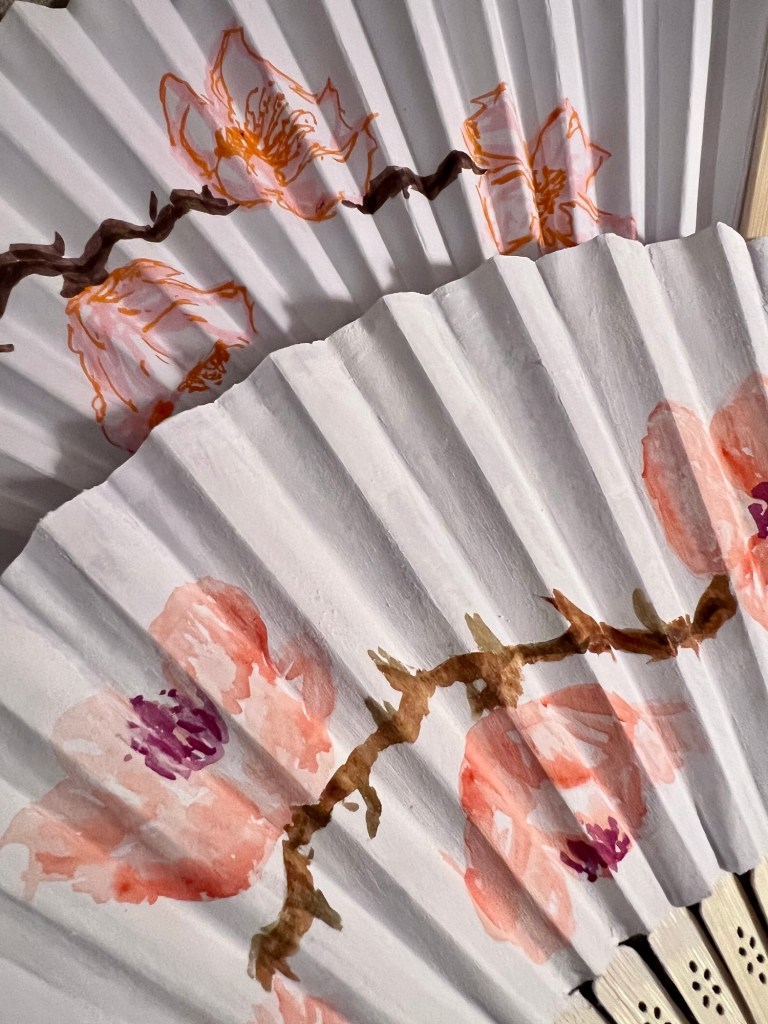 Earlier this week I was inspired to decorate a paper fan with a cherry blossom design. Since the paper was pretty thin I opted to use aqua markers. I liked how it turned out but it wasn’t quite what had in mind so I had the idea to use watercolor ground to treat the paper.