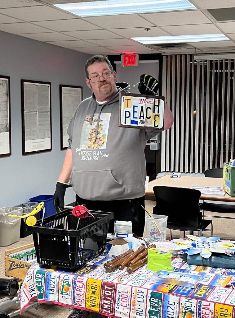 After the business part of our meeting is wrapped up we have some snacks and either a demo or critique. Tonight was a demo from a License plate artist, Dusty. He showed us how he cuts the license plates and folds them into various forms such as trays, barn-stars and bird houses. He then invited us each to chose a license plate from his collection and made us each either a dragonfly yard decoration or a tray. My son chose a tray which turned out really neat, and I picked a dragonfly. It turned out so cool! He is so fast and was able to make everyone in attendance a souvenir in the hour allotted for our demos.