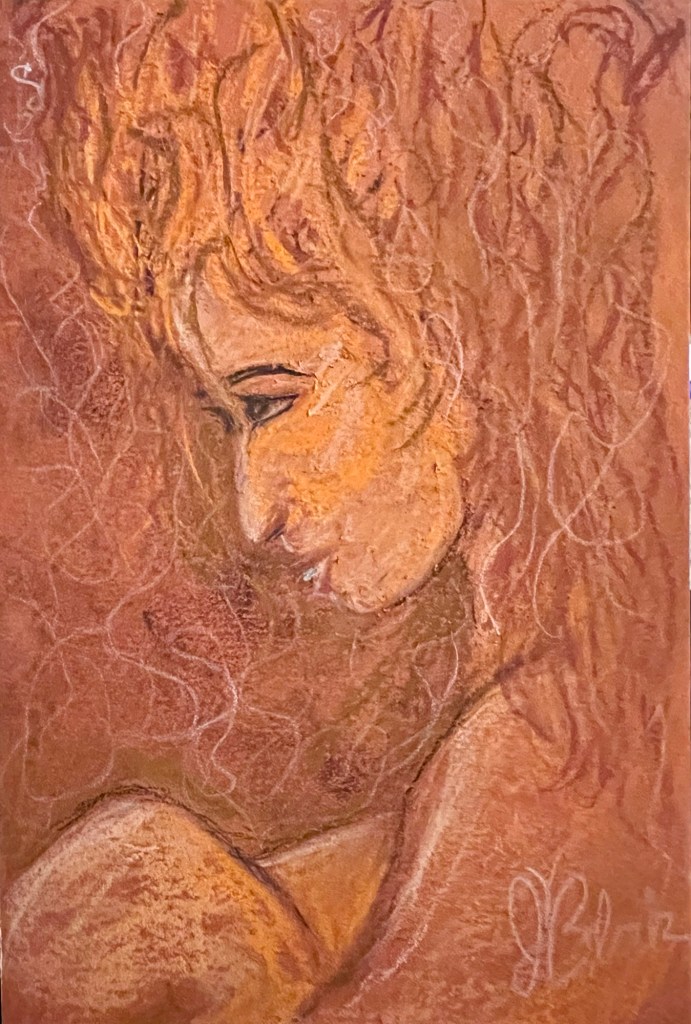 This months box had toned paper, charcoal, pastels and som pastel pencils that I used to make a quick drawing this evening. I used the general motif from Rooted in Sorrow, but instead of having the figure turning into a tree I decided to make her on fire. I don’t usually use such movable mediums so I kept accidentally smudging areas and having to go back and add detail.