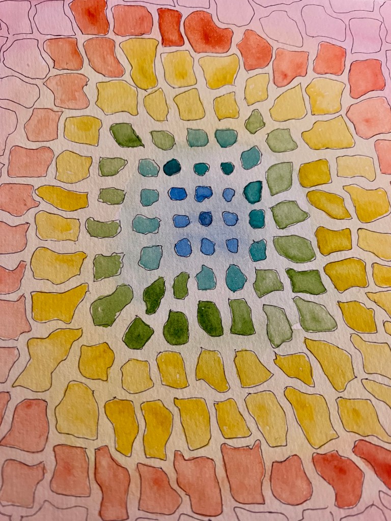 Today is a cold wet grey Michigan day, so I felt something bright and colorful was in order. I took a break from my gouache today and popped back into watercolor mode. It may have been inspired a bit by my Weather map abstract that I dropped off at the War Memorial today for its place in the Today’s Weather show opening Thursday. That one is also a bright and colorful watercolor abstraction.