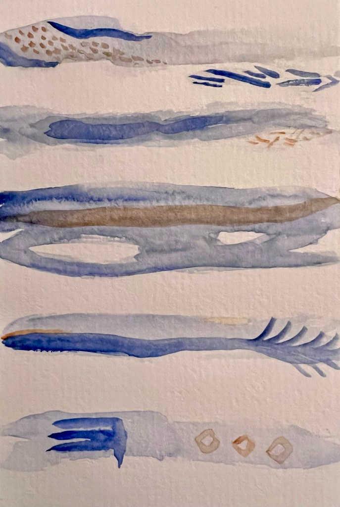 I limited my self to values of blue with a little bit of reddish brown for an accent. It was very reminiscent of the stitching and metal rivets on my jeans. I started off with a series of horizontal bands of blue and made them each different, evoking a worn ragged look. Then I added some detail with both the blue and brown to create areas of variation and wear, as well as dots and lines representing sewn and embroidered areas.