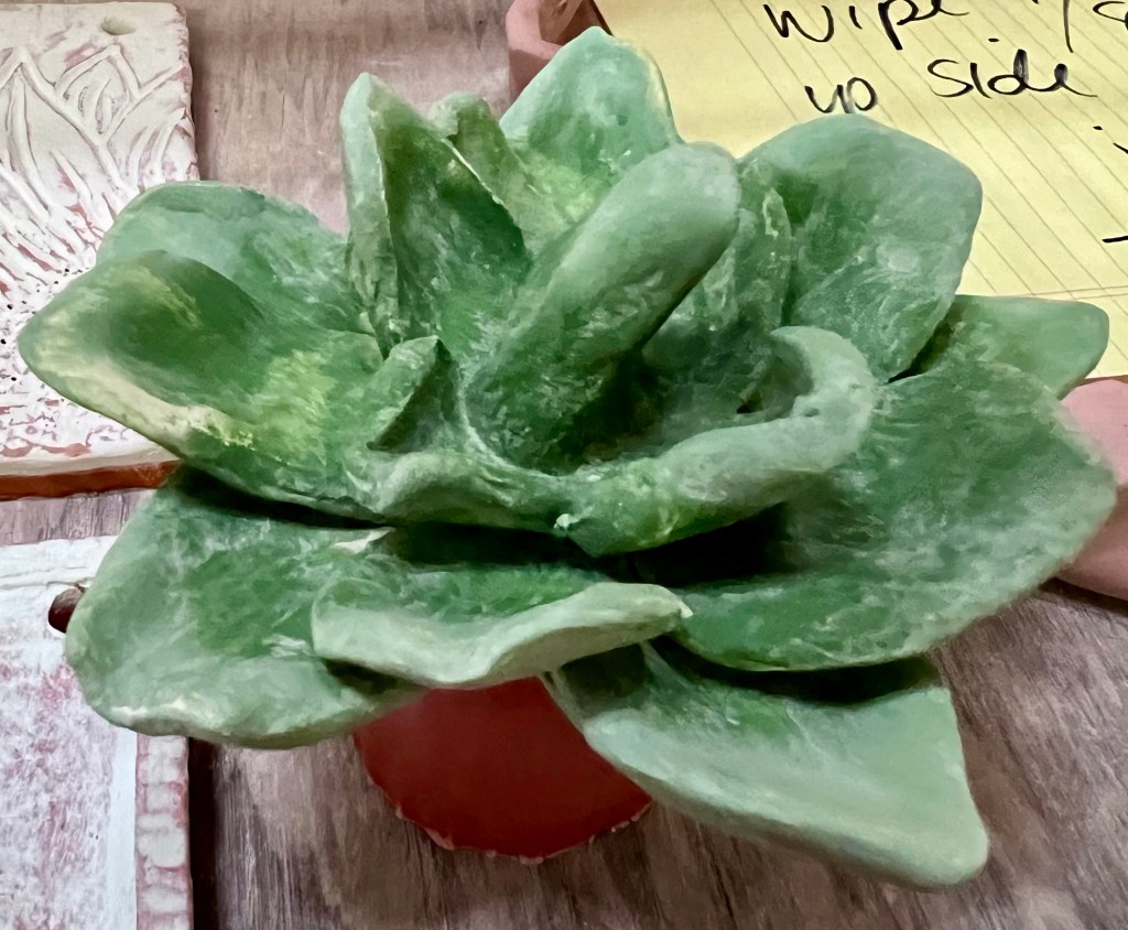 For my succulents I usually glaze them with a high fire glossy glaze, mostly in shades of green. Today since I was planning on using the underglaze on the flower stems I figured I might as well use it for the succulent leaves as well. I was debating applying a clear coat over the underglaze but decided to leave it be. When it comes out of the kiln it will be a little duller and won’t have that glossy look to it. I’m eager to see how they turn out.