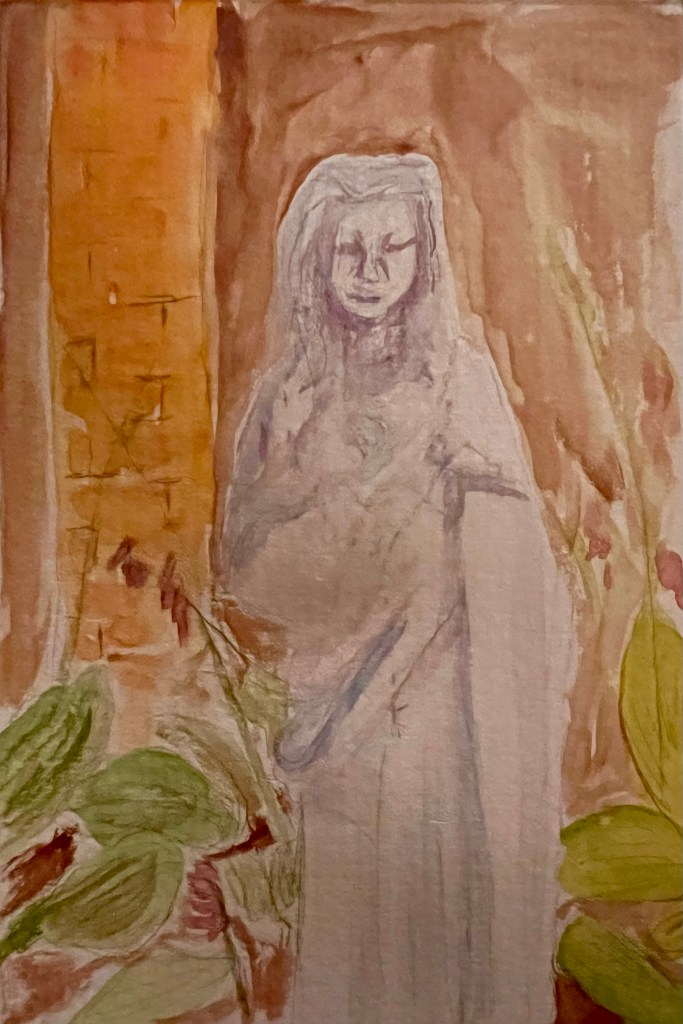 I pass by this statue each morning when I walk my son to his class door. She is beautiful in every season and I often take photographs of her, graced with the morning light. Tonight I paint her while praying for the community to rally around our school and keep it vibrant for years to come.