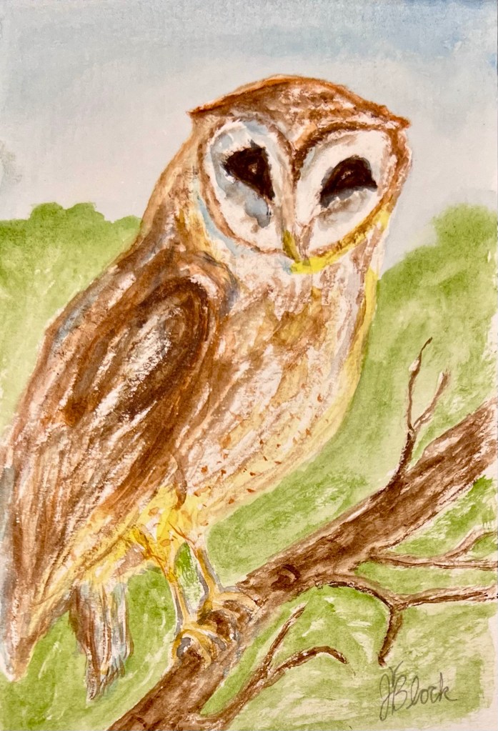 This barn owl is one of my favorites, and I decided to paint him in watercolor. I added a background and embellished the branch on which he was perched.