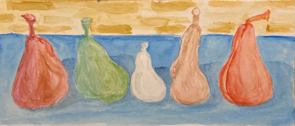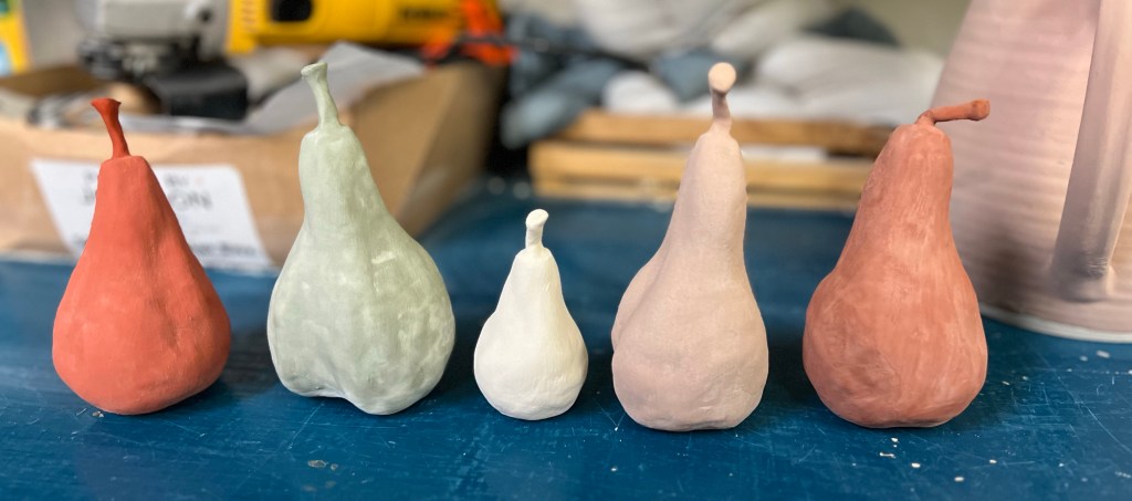 I was at our clubs studio this afternoon to help club members with their online entries for our next show. I arrived a little early so decided to start a painting. I flipped through my photos and came across one I took of some pears I was using as test tiles for glazing. These had glaze applied but were not fired yet.