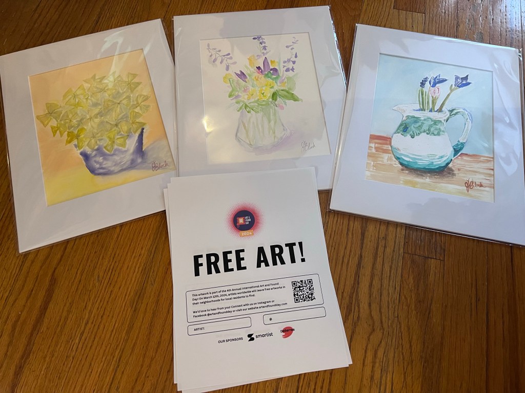 It was a lot of fun participating in the Art and Found Day. I had my daughter help pick out which watercolors to give away and she picked a group which were variations of flowers or plants in a vase or pot. She included the painting I just finished last night. Along with that bouquet, she chose my shamrock painting and my pottery pitcher and flowers watercolor. Three great choices. I hope their new owners like them as much as us!