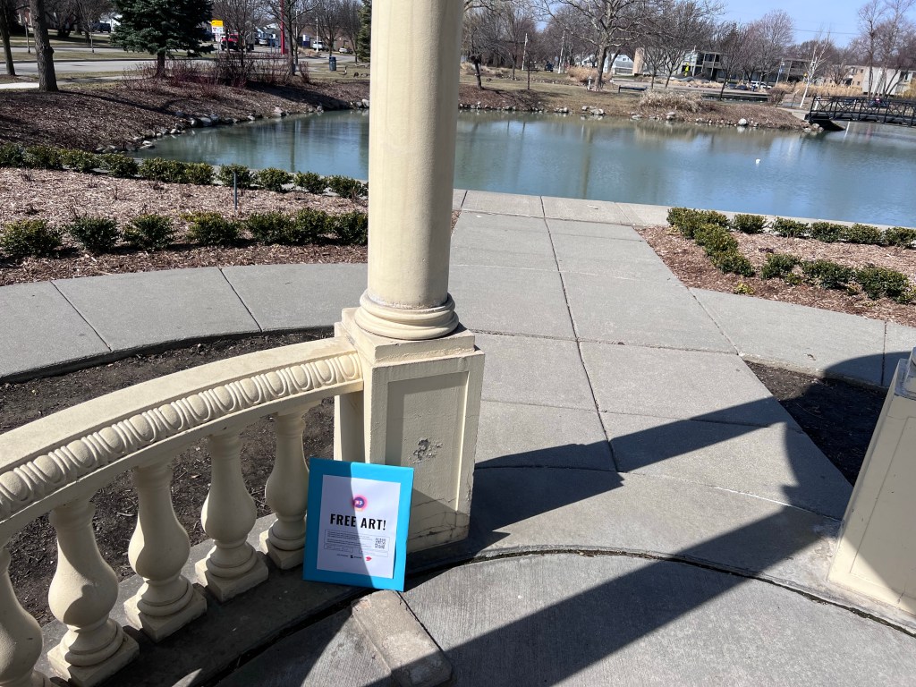 After choosing the art, I matted them and wrapped them up with the Free Art sign taped to the front. We didn’t have time to put them out before we needed to be at the War Memorial to hang the art in our upcoming show, but afterwards we hid them around the city.