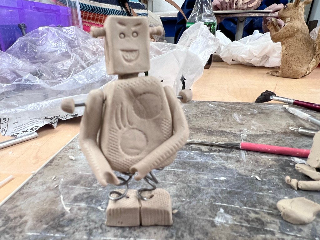 Today was a productive day back in pottery class. I brought home several finished pieces including the chain I made last month. It turned out really good. I then glazed some of my bisque pieces that I made before the break. Then I was able to work on my planned project of making a robot. I ordered some high heat wire to use for the robots legs and articulation.