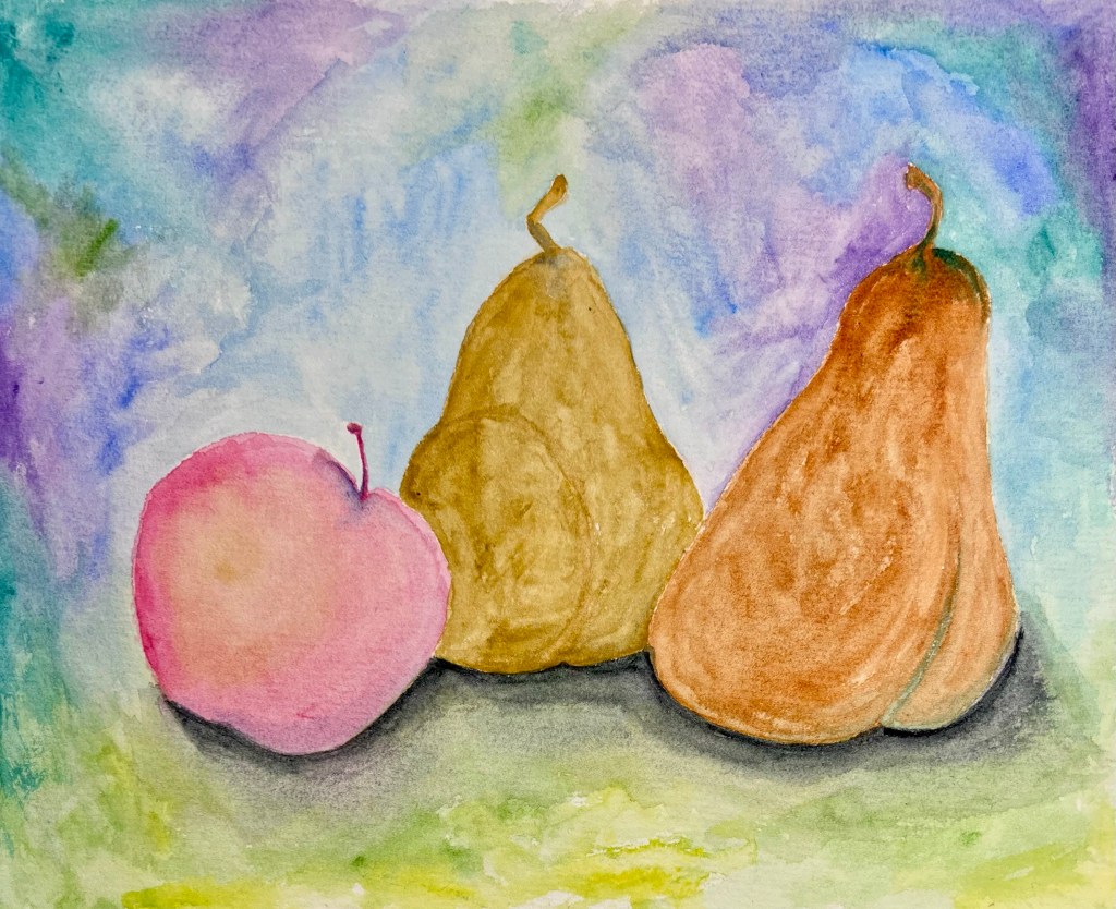 After getting home my youngest was still awake and wanted to paint with me. He painted a scene from his favorite video game and I decided to paint an apple and two pears using all the colors in my me watercolor palette, except black and white, which I hardly ever use. I like how it turned out. This is my version of swatching. I much rather create something while experimenting with new colors than just paint squares. I do the same with my test tiles in pottery.