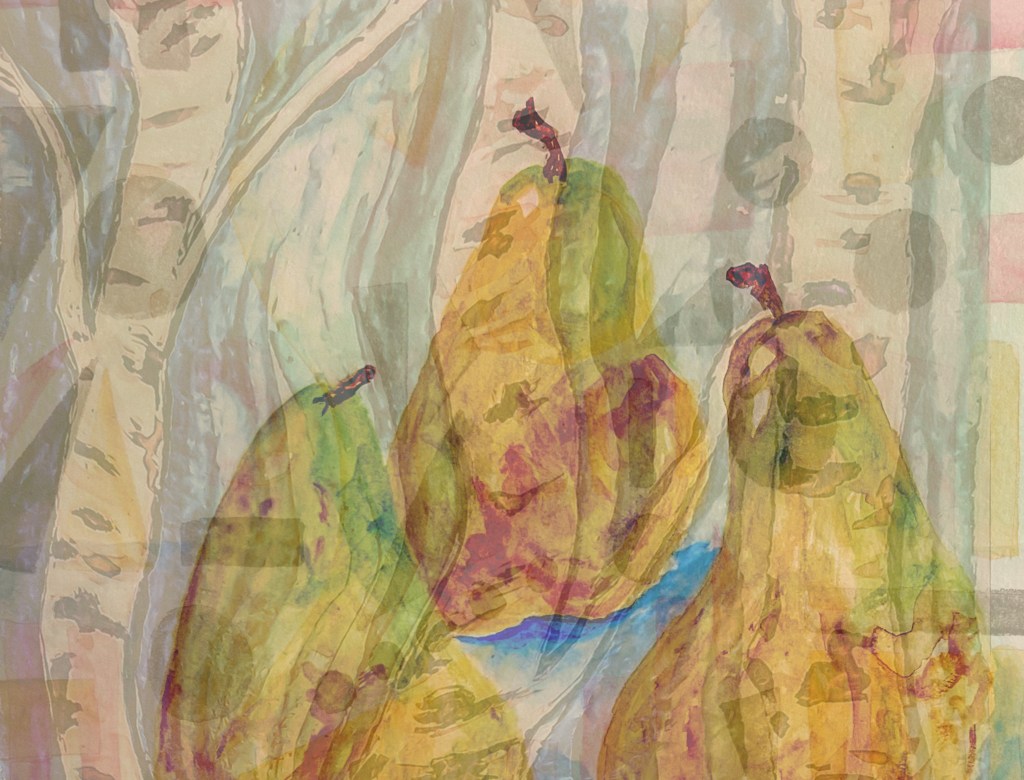 I also worked on this piece which has some of my pears prominent in the foreground. I like it, but I may continue to tweak it a bit later. I’m going to sleep on it for now.