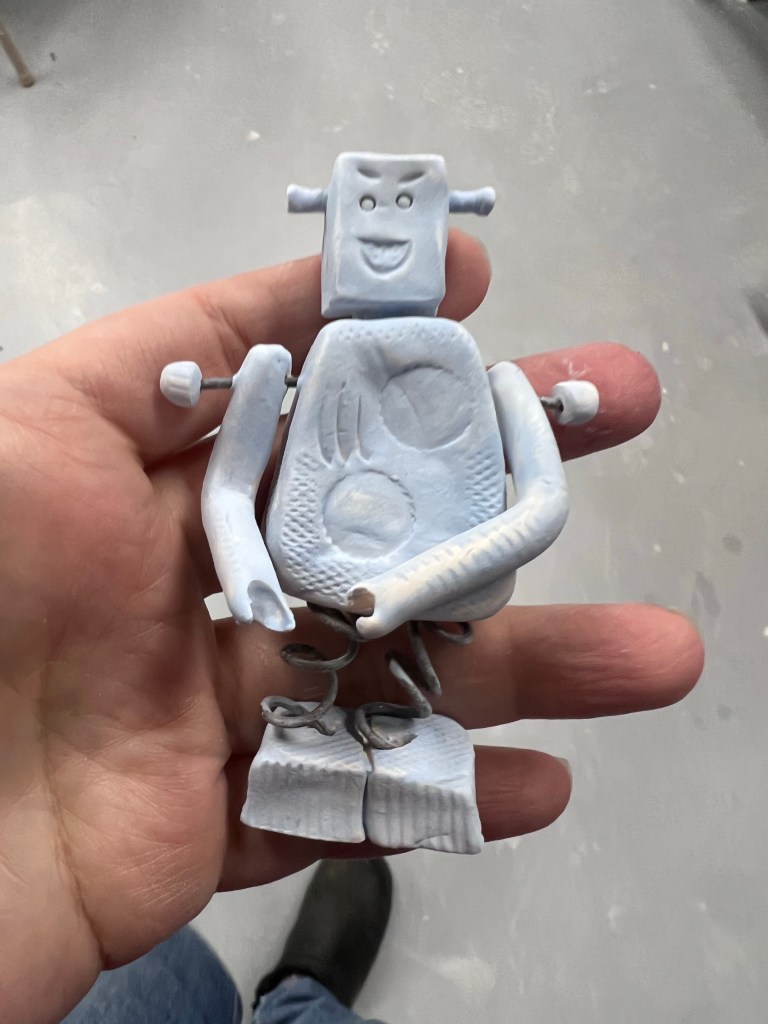The robot I just put some blue underglaze on and will paint with acrylic paint so I can get a metallic finish after he is glaze fired.