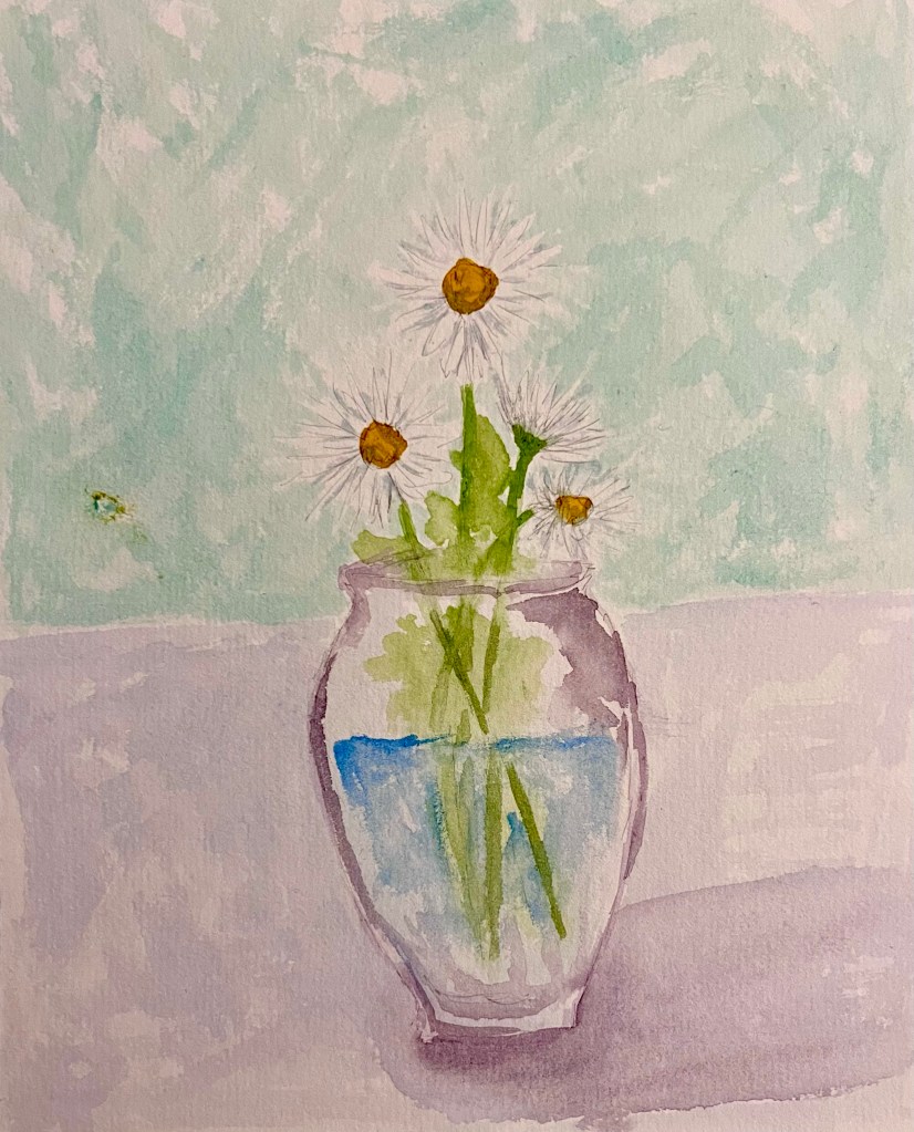 I don’t paint much glass and this was a good exercise in painting the glass with water and stems visible. Again, it probably would have been better if I had worked from a photo or actual vase and flowers, but I don’t think it turned out too badly.