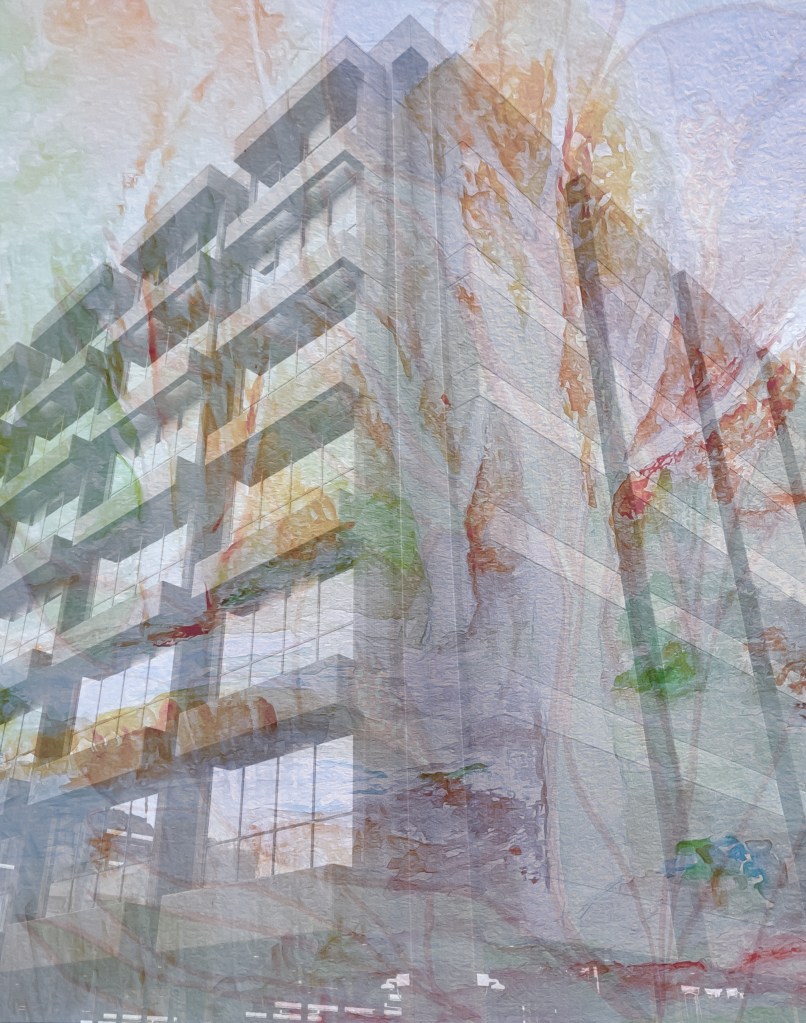 The change in the weather inspired me to change up my art and instead of another in the orange ink series I decided to do some digital collages with some of my recent photos and watercolors. I like combining elements of architecture, landscapes or nature and portraiture. I find this combo makes for interesting compositions, although sometimes I use only two of these three. I started with a photograph of the STEM building at Wayne State and composited it with an almost finished fall landscape and my crocus painting from the other day.