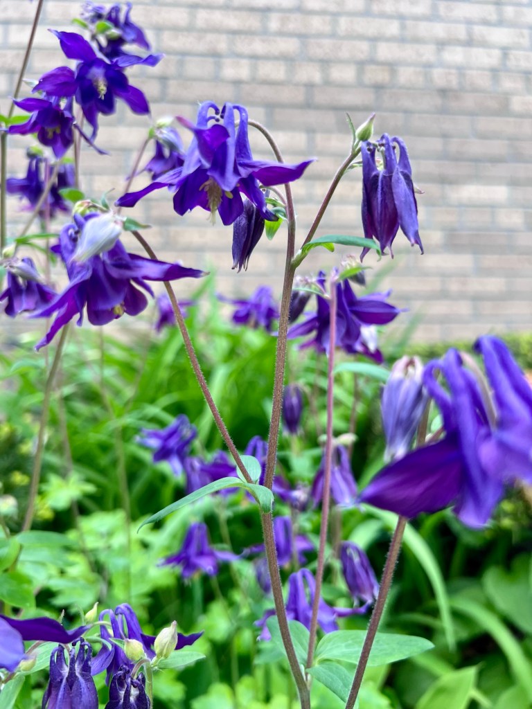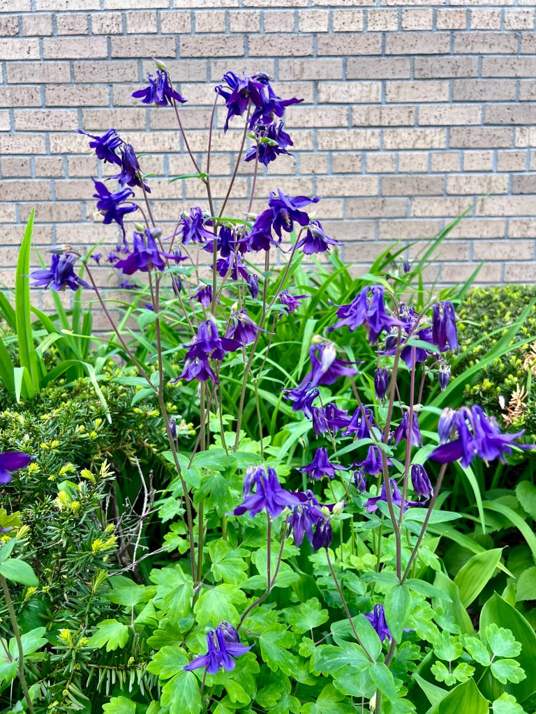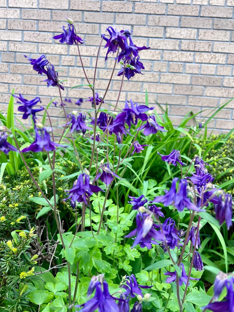 My kids had a four day weekend and today was their first day back. In that time the last of the daffodils and tulips have died off but some new blooms greeted us this morning. Purple columbine and lily of the valley! My mom had columbine in her garden and I’m sure there will be some in bloom in Oscars when we go up for Family Camp in a couple weeks, but those are the pink and yellow flowers. I really think these purple columbine pop in the greenery.