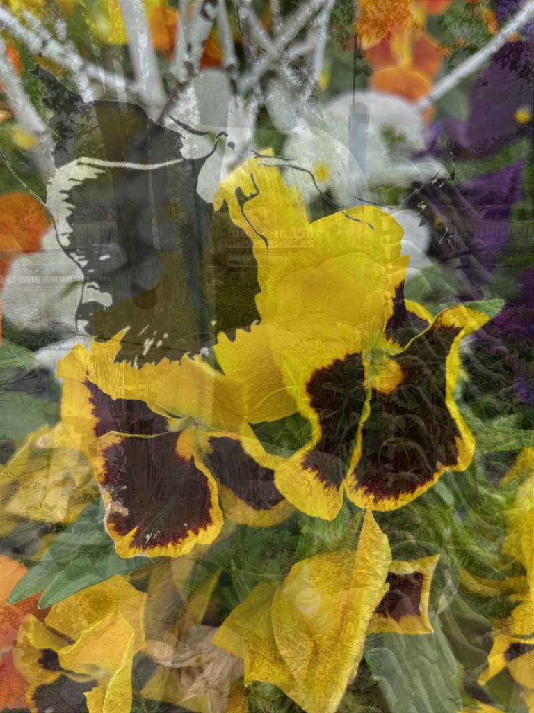 Today was a very busy, very long day. I can hardly keep my eyes open to type this. I am so exhausted my skin hurts. So I decided to try and make a composite photo. I kept dozing off in the creative process and my thumb would be randomly touching the screen. I decided once I got to this stage I should be done. I was thinking these pansies would make a good orange ink painting, but as I’ve only seen them around in pots, I don’t know if that should count for being ‘in season.’