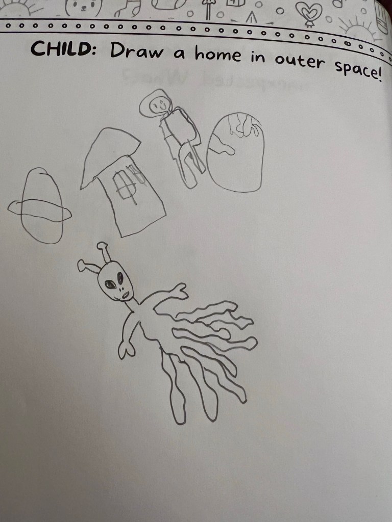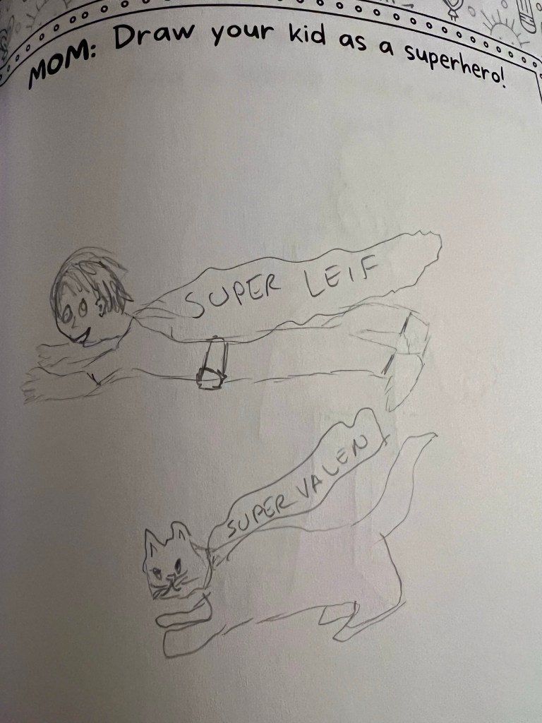 For Christmas, ‘Santa’ brought my son and I a ‘Draw with Mom’ book. Each page contains two prompts, one for the kid to draw and the second for mom to add to or embellish their kids drawings. My son loves working together on our book as much as I do. Tonight after dinner, I suggested we work in our book together. An evening of fun and laughter ensued. The highlights of our evening were the Space Whale at the end of the rainbow, The Oct-Alien, making his home in outer space and, last but not least, Mom Leif and Valen as superheroes- always ready to save the day.