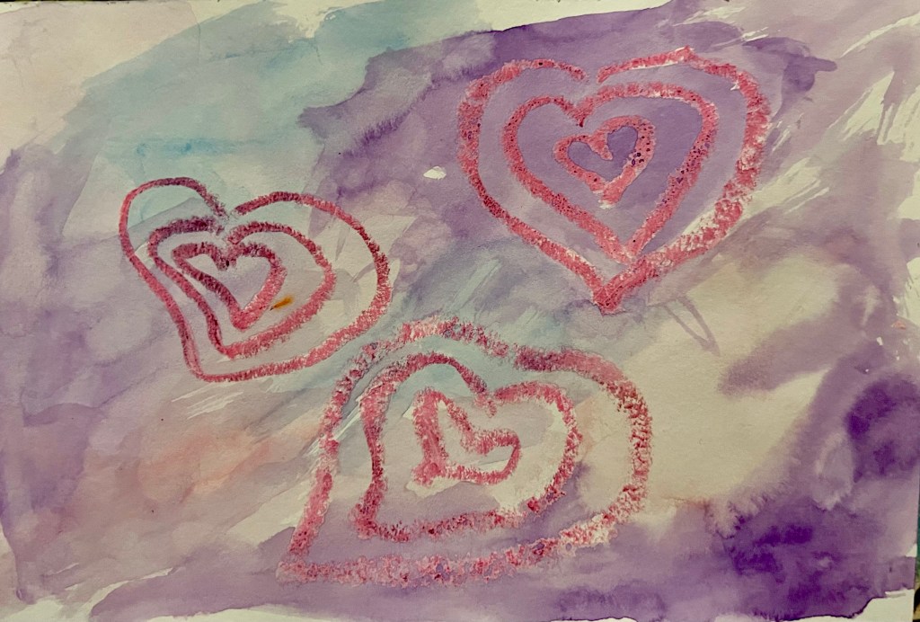 My youngest and I were finished before the rest of the family, and he was ready for a new activity. We stopped at the painting table where I tried to show my son how to use oil pastels as resist. He was inconsolable as he only wanted to paint with pink watercolor paint and there was none. So I finished this piece, and my husband carried out sobbing son to the car.