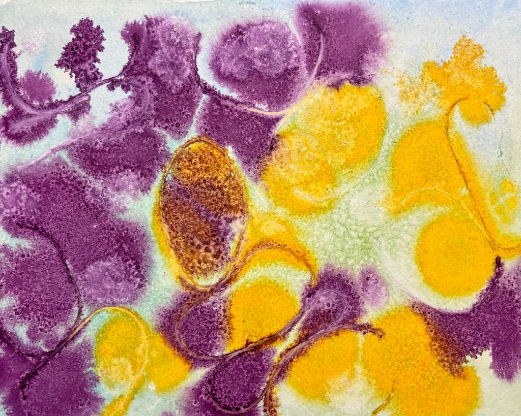 This morning when I woke up I checked my painting even before I made my first cup of coffee. It was finally dry! After making my husband his special Father’s Day Café Mocha à la Jackie, and myself a coffee, I started to remove all the salt. This is the first time I’ve used salt with acrylic inks so it was a much more involved process than with strait watercolor. The salt, though, left an interesting texture both visually and physically, especially on the areas with the white india ink.