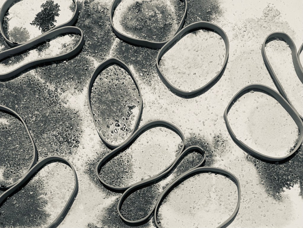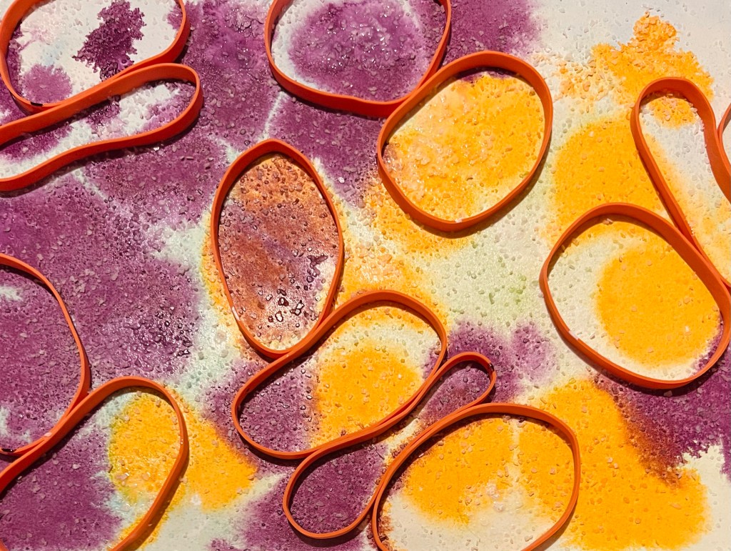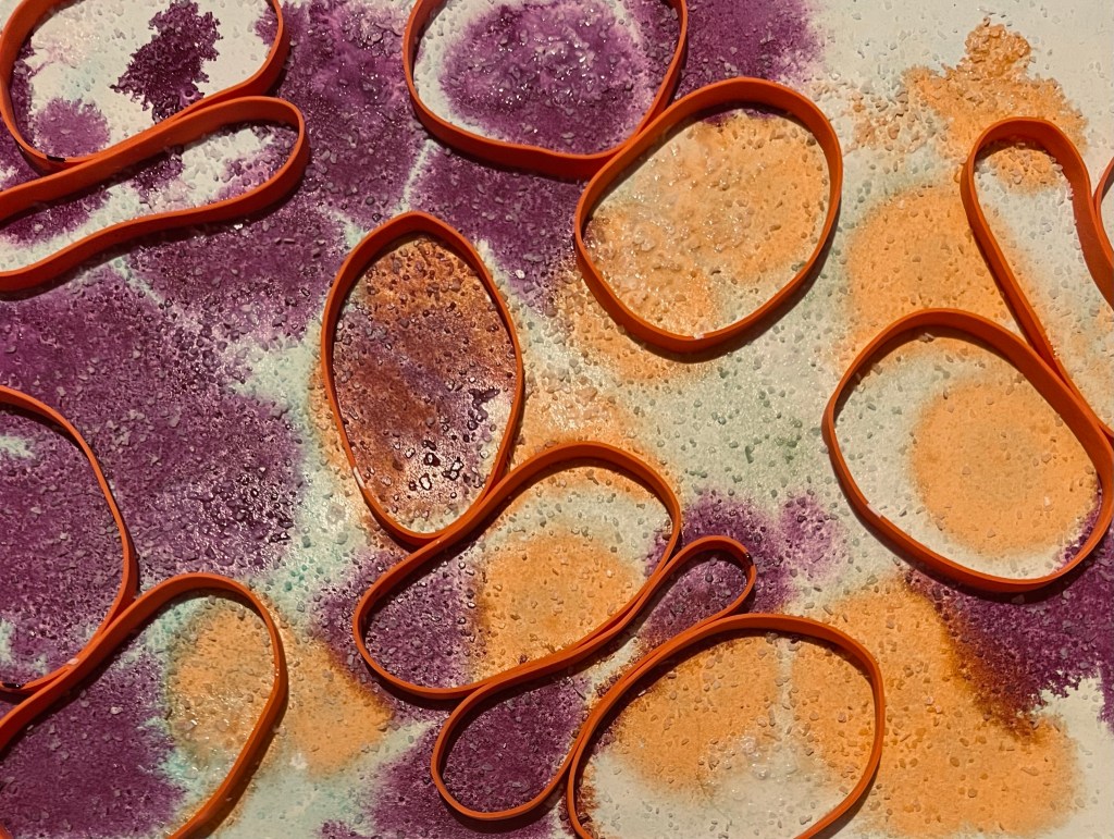 What I’m doing tonight is first I applied watercolor to the background in blues and greens. Then arranged the rubber bands on top, before dropping yellow and purple acrylic inks and some white India ink. Then I decided I wanted some more texture and threw some course salt on top.