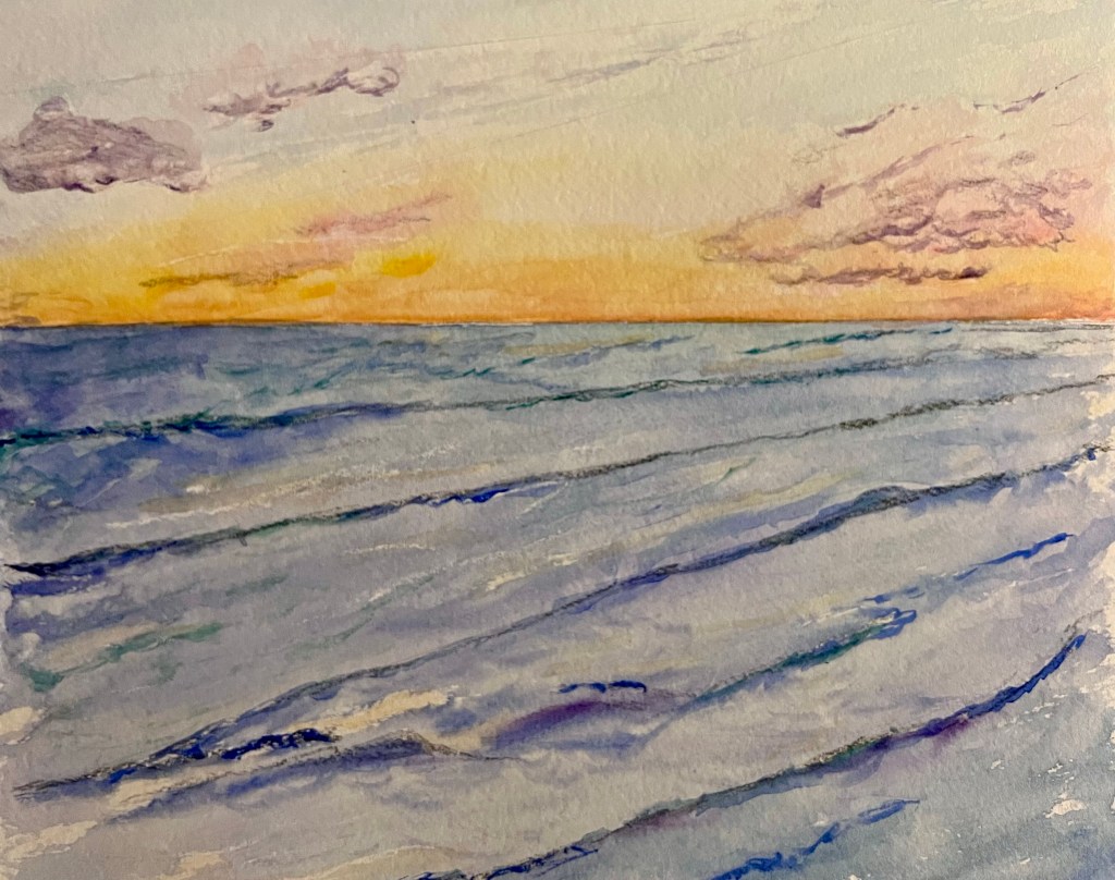 I decided to practice some waterscape painting today. I could use practice on painting water and the sky so this works for both. The waves on Lake St Clair are usually much choppier, but I was trying out a technique I read about when painting farmland and how to put the rows of crops at an angle for more interesting paintings. I figured the same could be applied to water. It does look more interesting than previous paintings I’ve attempted. I did a similar thing with the sky but much less dramatic. My next attempt I might add some boats in the water and birds in the air.