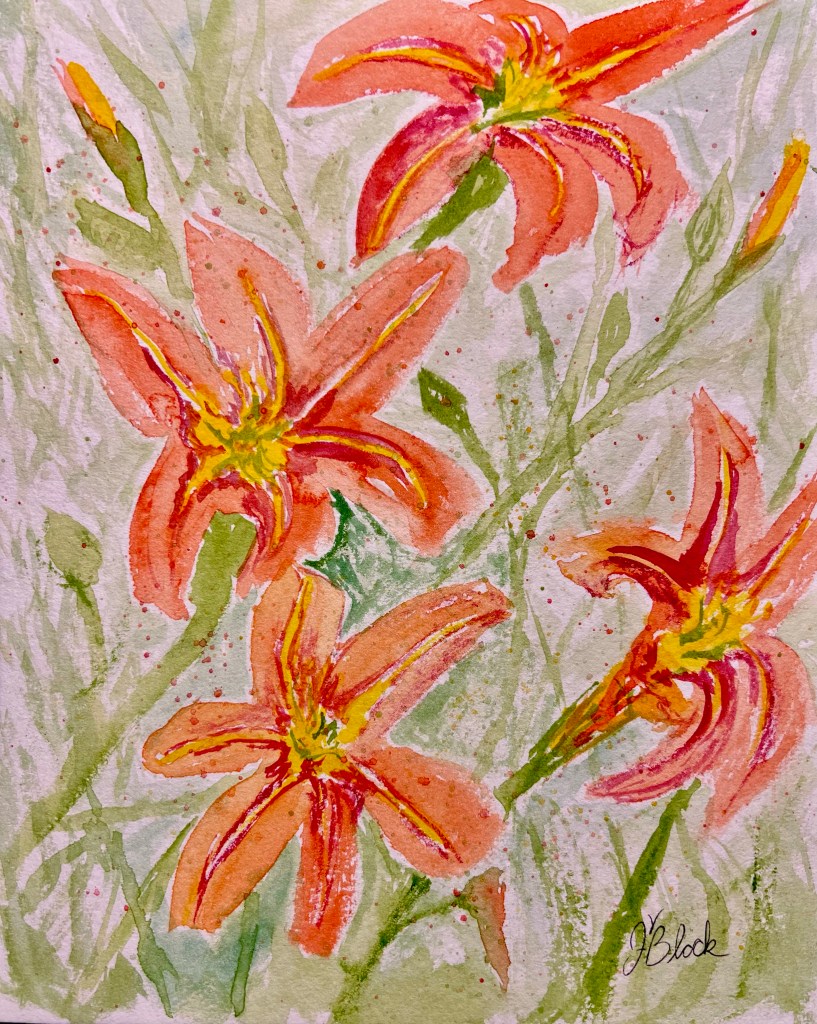 I decided to revisit my day lily painting from yesterday. While I liked it, it took me a lot longer to paint it than I wanted for a loose watercolor. So tonight I painted the day lilies again, this time using my painting from yesterday a a reference instead of my photo. I think I did a better job on the vibrancy and contrast in my second attempt. I, also, did paint it faster, in spite of a few distractions thrown my way.