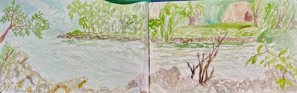 I continued my pattern of painting across both pages of my watercolor notebook, as I did for our paint-outs at the zoo and Belle Isle.