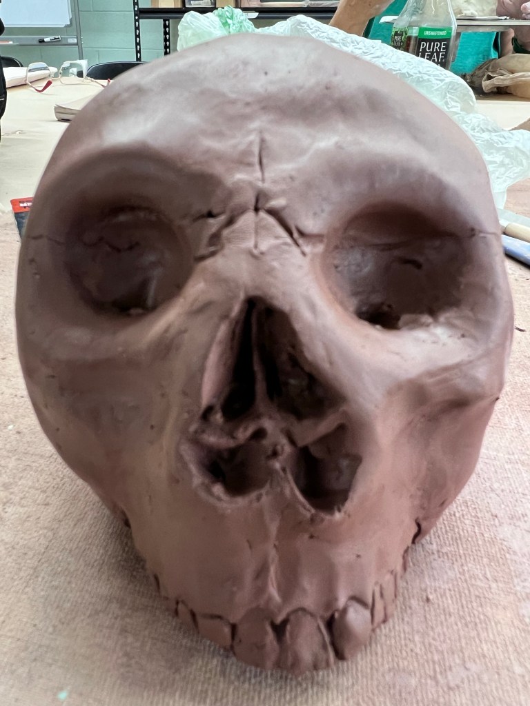 So today I had no plan for what I was going to make at the pottery studio, but once I started to work the clay I began forming a pinch pot. When I looked at the outside of the bowl the cracks and lines reminded me a bit of suture lines on a skull. And with the macabre fresh on my mind from my painting the other day I made by bowl into a skull. Since I wasn’t carving in the lower jaw I decided to make a separate mandible to display next to it. Once finished I posed the bowl atop the mandible and it fit perfectly. He suddenly was a cute skull bowl. I decided that I’ll fire them together so hopefully they will fit together when finished. After that, I thought might as well make a more realistic skull, too. I think I’ll have some nice Halloween decorations, although I already have someone interested in. Purchasing the bowl.