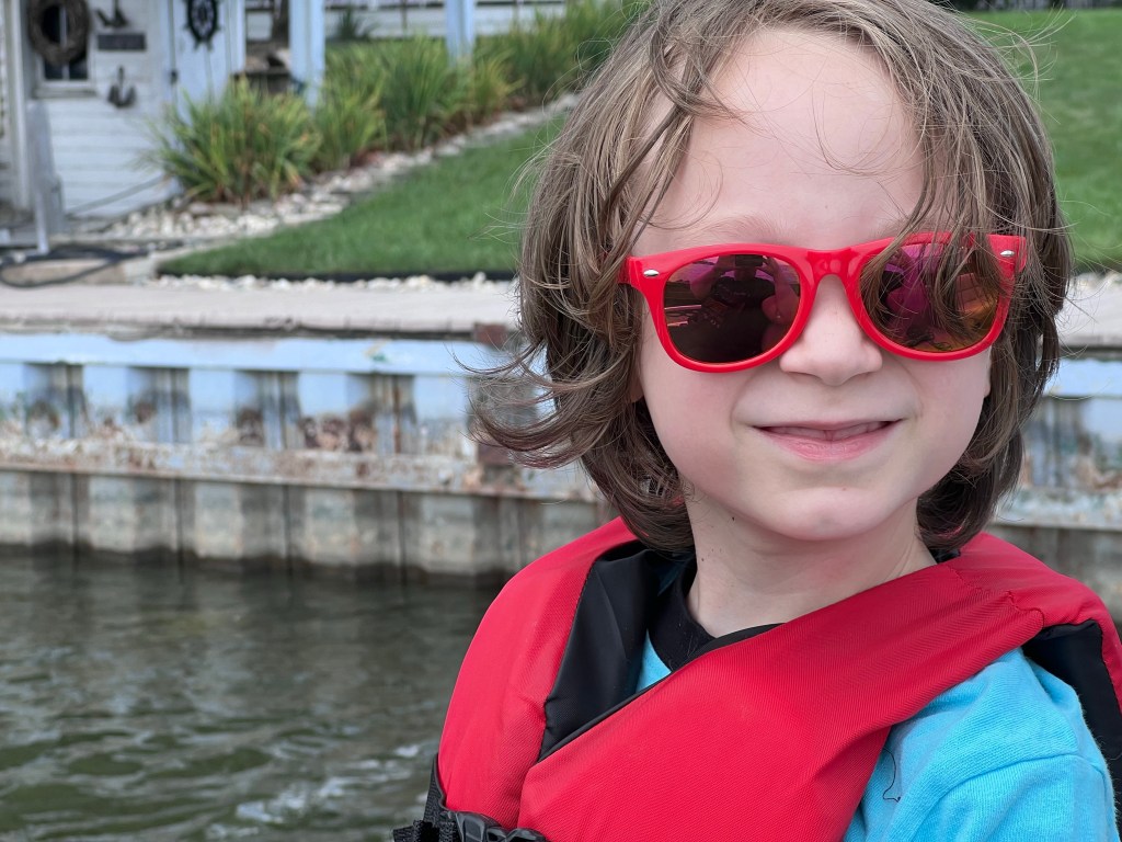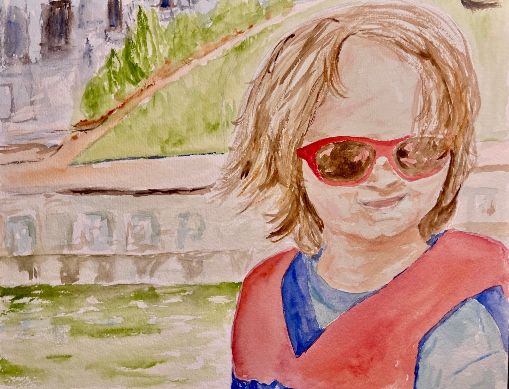 This afternoon my mom invited us out for a boat ride since the weather was nice then, before the evening rains moved in. It was a beautiful day to be out on the water- the sun was shining but the clouds would move in periodically to grant us shade. In the canal back home, I snapped a photograph of my son, and thought it would make a good watercolor.