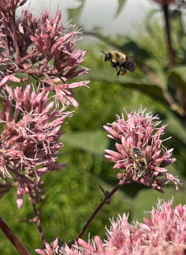 This picture had a bee approaching some Joe-Pie weed blooms. I took about thirty or so pictures of the bees around the Joe-Pie that day, because they were so attracted to the blooms. I like the feeling of movement with the bee mid flight, beginning to curl in for landing.