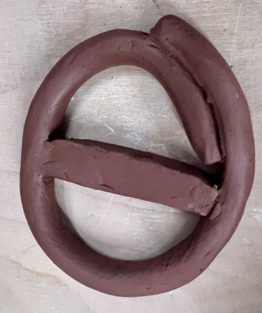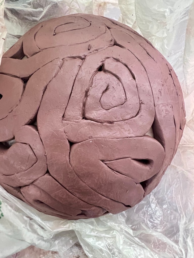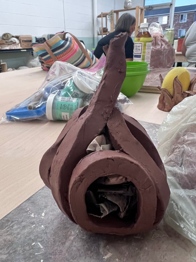 After that, I made a bowl using square coils. This was pretty time consuming – scoring and slipping all the pieces together, but I think it turned out rather nicely. I have it covered in plastic so I can refine it a bit once it’s leather hard. I had leftover coils and scraps, so using those, I experimented with making an abstract pear and a pendant.