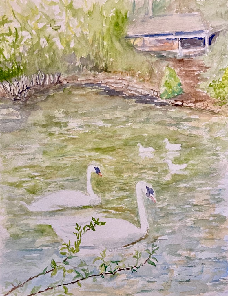 This morning was our club’s Zoom with June, and I was chatting with my fellow artists while flipping through my photos to pick what to paint today. One of the gals mentioned she was going to work on her swan painting just as I was flipping by one of my swan photos. I figured it was kismet. Sometimes I struggle with getting the feeling of depth in my paintings, but I thought this was one of my better attempts. I also have been seeing improvement on my painting of water. Even just last year that was a big challenge for me.