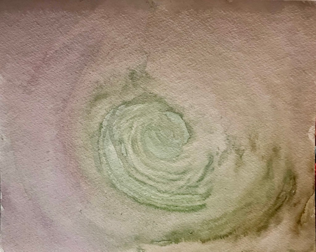 Today I decided to start working through my pile of unfinished art. It is getting quite large. This particular one just had some colors swirled around in a spiral. Lots of room to image up something. The lower part of the spiral looked like a road leading into a tunnel, so I used pencil to sketch in the path. Then I thought maybe trees along the sides of the path could make up the tunnel I was seeing. I really liked the idea of having a gnarly tree up front and it flowed with the outer spiral.