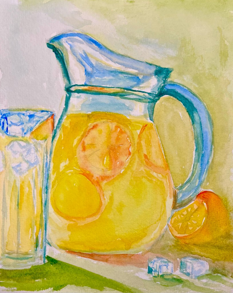 I decided to paint a lemonade pitcher that he can have on his table. I also have an idea to paint pictures using people’s first names. I just had this thought today so I’ll try it out with my family’s names during tomorrow’s zoom. I’ll show them off in tomorrow’s post if they turn out. Whether I go with the name idea or just paint a mini painting on the spot, if you are a follower of my blog or social media, stop on by my house 10-4 Saturday or Sunday and I’ll make you one for free.