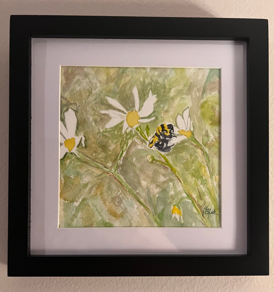 I gave a bunch of art work I had hanging in my house to my brother-in-law for his coin shop. He just opened recently and has bare walls. He was happy to take some of my art to display and perhaps even sell. This left my walls a bit bare so I thought I’d frame some of my recent work. A few days ago I shared the bee and daisy watercolor, and as I was putting it in the matte I realized I hadn’t signed it. So I grabbed a pen and promptly signed my name- on the upside down painting. Oops. So I trimmed that painting up to cut off my mistake and put it in a 8×8 frame with a 6×6 matte. It still looks cute, just a bit smaller. And it covers the old clock outlet on my living room wall.