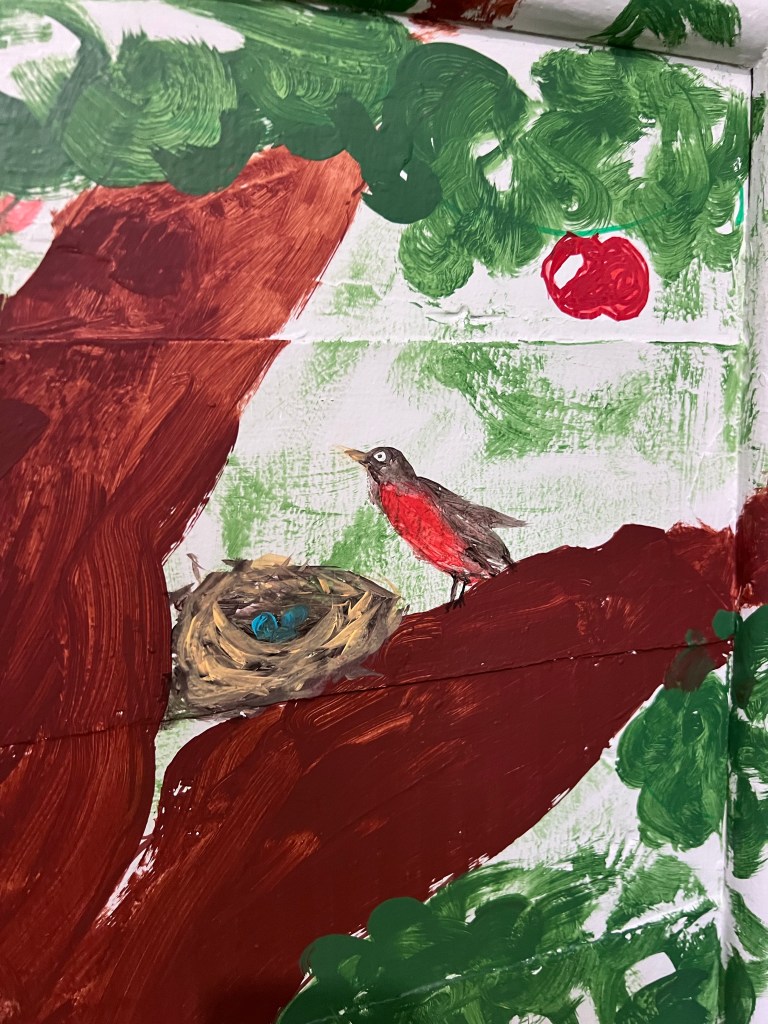 Once I got the horses painted, I painted the apples in the tree and added a nest with eggs and a robin watching over them. I am happy with my progress over the weekend. I think I impressed everyone at camp with how much I got done in such a short time. I’m definitely feeling it in my arms and legs though!