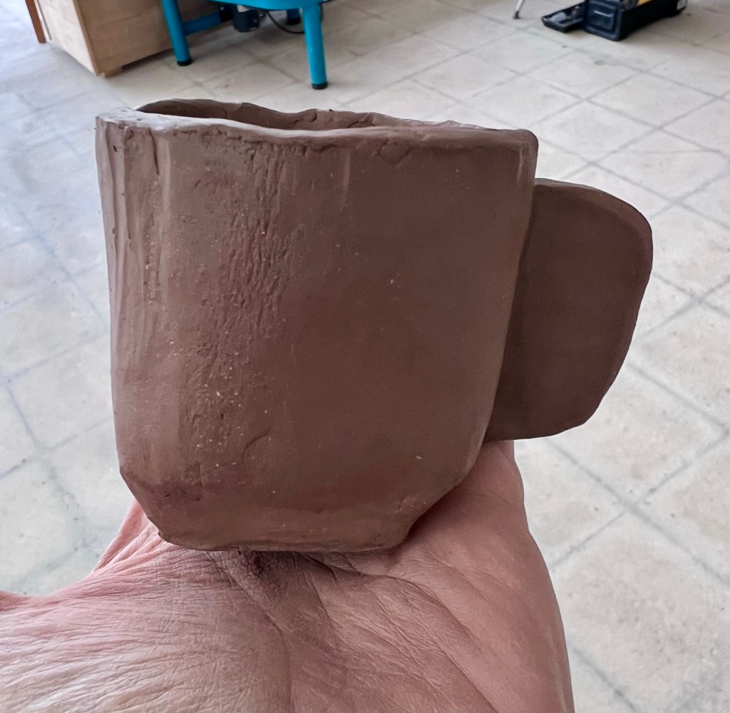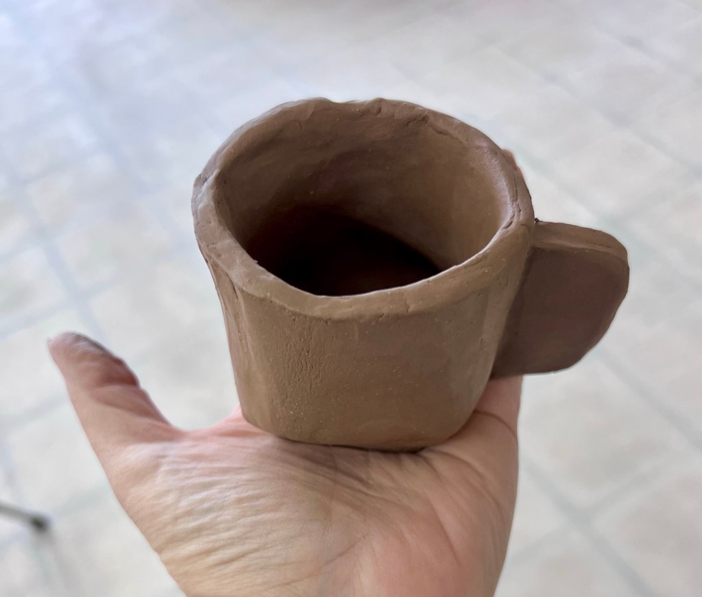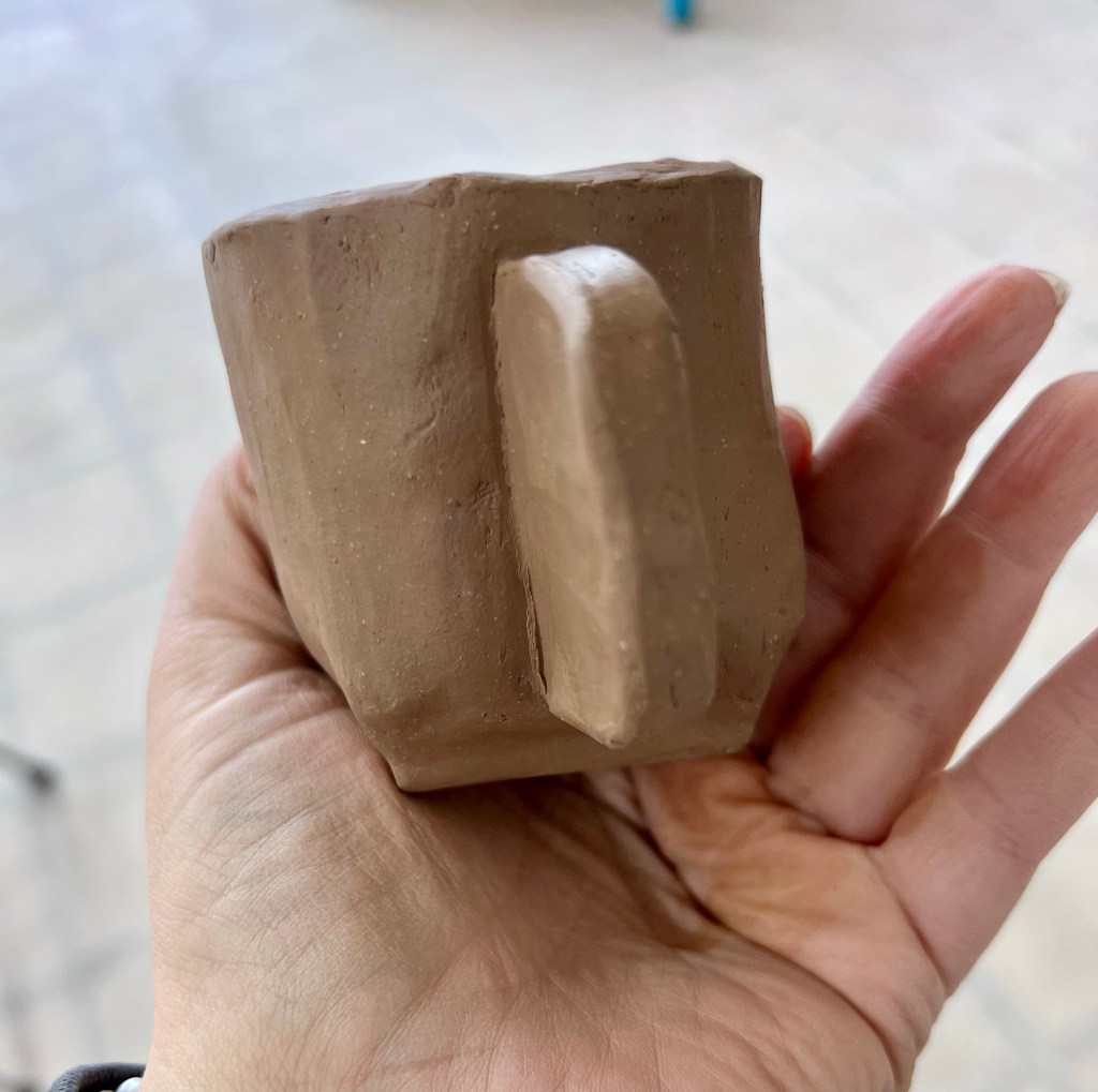 Then I worked on special requests from my family. First I started a prototype of a demitasse for my husband. I got him an espresso machine for Christmas last year and he has been perfecting his method ever since. He wants a set of mugs that are smaller than my tea cups but larger than my shot glasses. I figure I’ll make one at a time until I get his approval and then make a set of four and a little tray for them. This is a new design I am using; folding the clay at the bottom of the cylinder to form a square base. I also tried a new handle design.