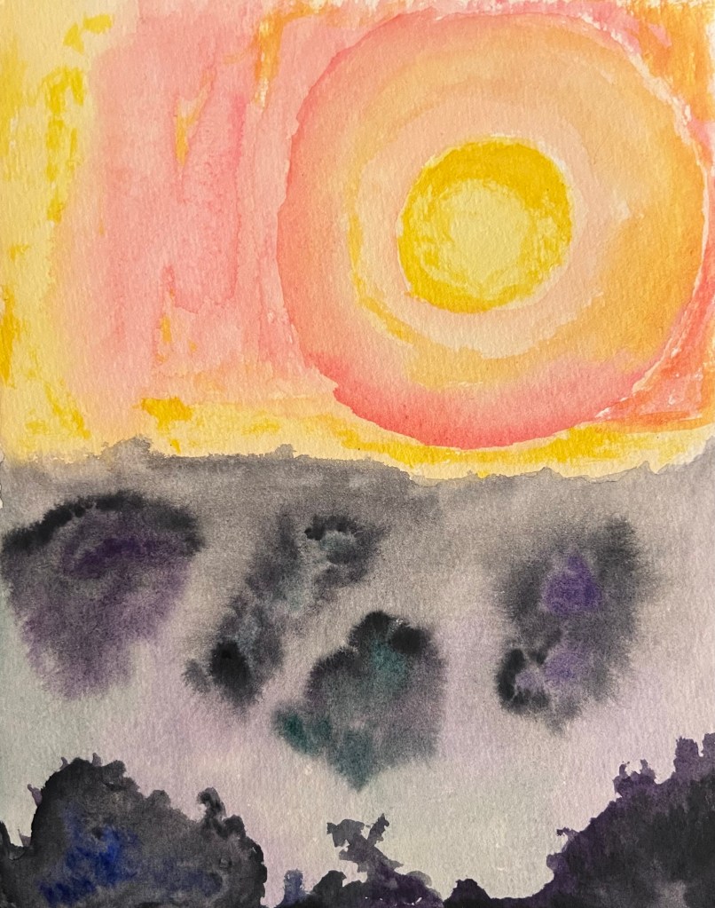 Today’s painting developed as I painted. I was originally going to paint a yellow rectangle, but decided to start with a circle. A yellow circle got me thinking sun so I started adding orange and reds around the top half for a sky. Since the sun was low I figured it make the land dark, with indistinct shadowy, blobby bits. It seems like an alien landscape so I liked it. I added a little color to the dark blobs and think it is done. It’s still wet, so I see if it needs something more tomorrow as sometime it seems to loose quite a bit of vibrancy once it dries completely.