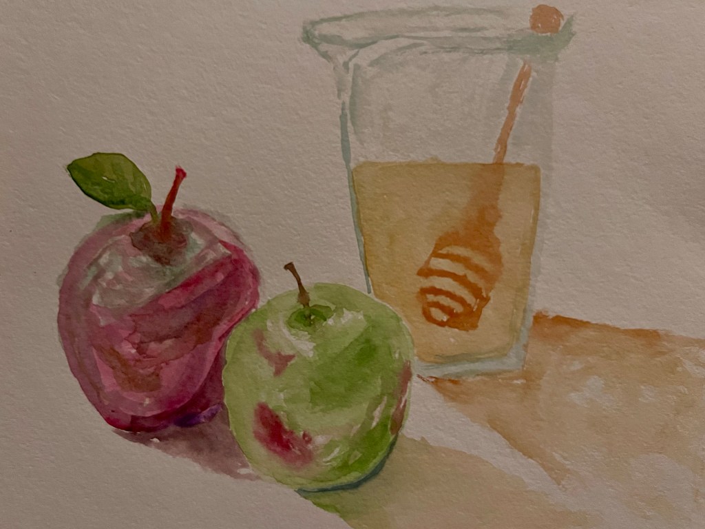 This evening I decided to paint some apples and honey for the Rosh Hashanah holiday next week. Last year I gifted my friend who hosted a ceramic apple. This year I thought a watercolor would be nice. This is a practice painting for the one I’ll make for her. She reads this blog regularly so I won’t post the real deal until after she gets it in person.