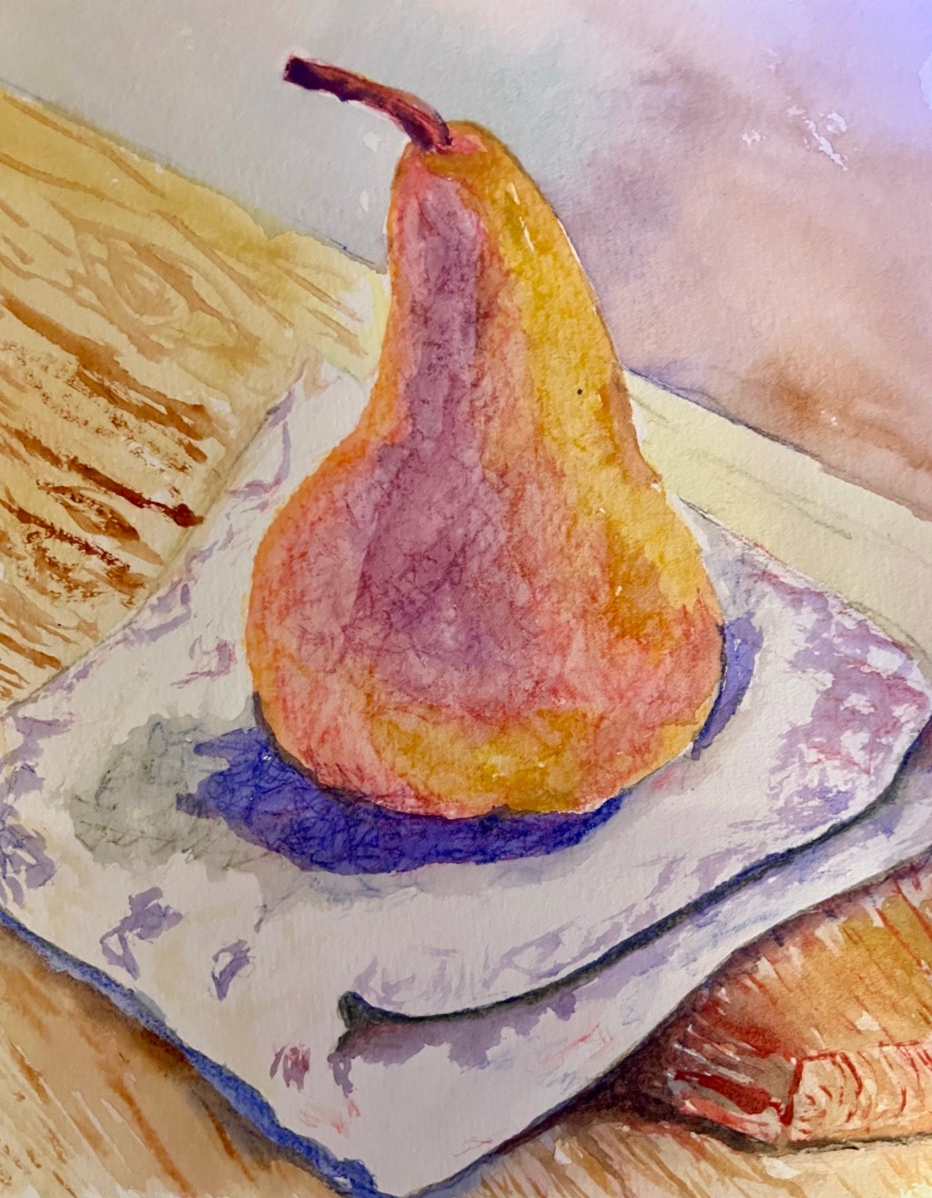 I sketched out the pear from my model, and blocked in the pencil color, then today I activated it with watercolor paint rather than just water. It worked just as well for this painting and saved me some time as I’m tired and want to get to bed soon.