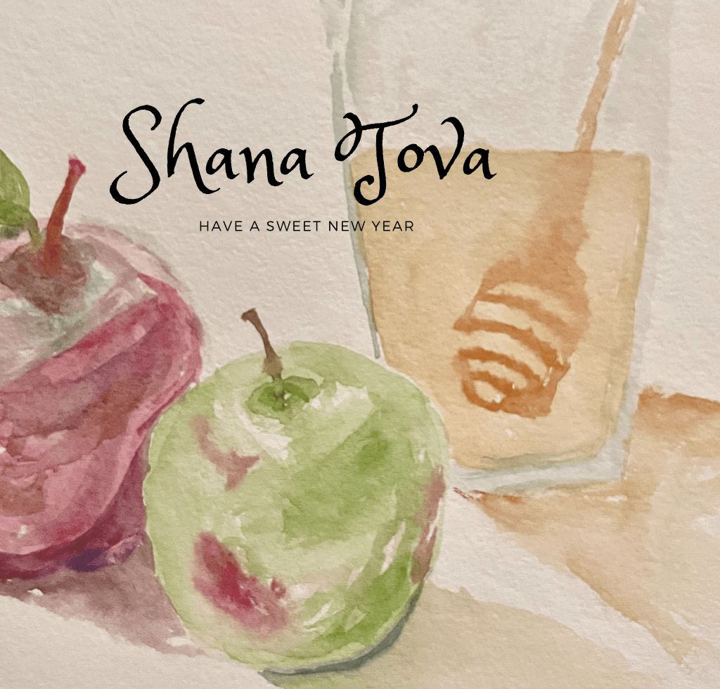 My wonderful friend hosted a lovely Rosh Hashanah dinner his evening where she cooked everything gluten free so I could enjoy the meal with everyone. I almost forgot that I had made her a little pomegranate plate several months ago for this occasion. I nearly forgot, and was working on apple and honey paintings. I made this little graphic with one of those paintings so it was not a wasted effort. And I extend a Happy New Year to all who are celebrating; may the next year be filled with love and peace.