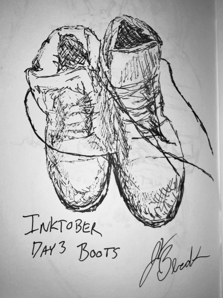 Today is day three of the Inktober challenge as well as the photo a day for the American Cancer Society. For Inktober, I started sketching these old boots while waiting for my son’s school bus. I was actually thinking originally that I’d take a picture of my youngest wearing my husband’s cowboy boots, but I had such a busy afternoon and evening coming up I opted for a simpler concept.