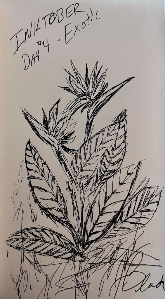 Then while I was waiting for my youngest’s bus to arrive I worked on my Inktober drawing of some bird of paradise flowers. Today’s theme was exotic, and I love being able to tie Farscape in even if it’s lost on most people. The flowers make their way into the Uncharted Territories, can’t get much more exotic than that!