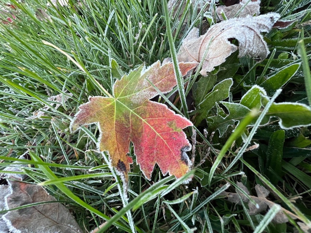 This morning when we left for the school but I pointed out all the frost on the ground. On the way back home I took this picture and really soaked in all the sensations. When I got home I decided to write a poem inspired by the frosty morning.