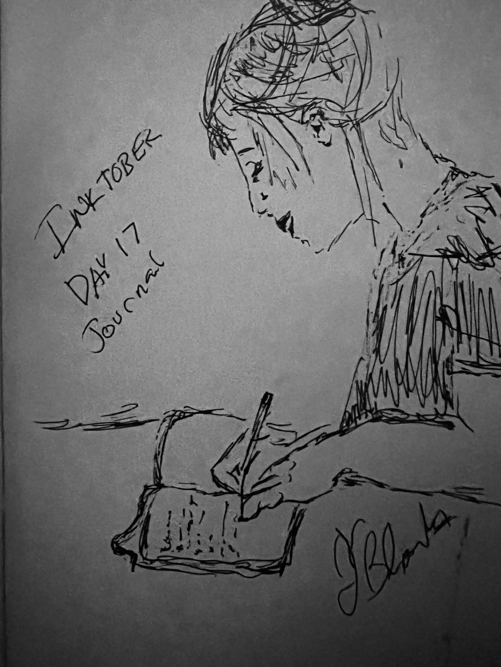 Today’s inktober prompt was Journal, but since I used my journal as the model for the guide book prompt two days ago I had to think of something else. My son suggested I sketch someone writing in a journal, and I decided to run with that.