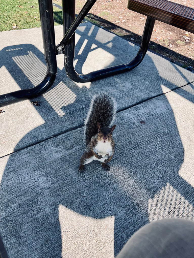 Waiting for the bus this afternoon, my squirrel friend has gotten brave enough to come right up to me and pose. I didn’t even have to zoom it in. Isn’t he cute? Or she. Hasn’t gotten that close yet. Lol.