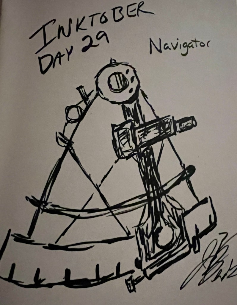 I was determined to finish the rough draft of my script last night before I went to bed. So a little after 3am I finally typed “Fade Out.” That gave me only two hours of sleep last night so I’ve been a bit scattered today. So with a prompt like navigator, I decided to just go pretty literal and sketch a sextant. They are pretty neat devices, although I myself have only seen them in pictures or behind glass at a museum. I looked at a few different pictures of sextants and there are some variations, so I used a bit of my artistic license here.