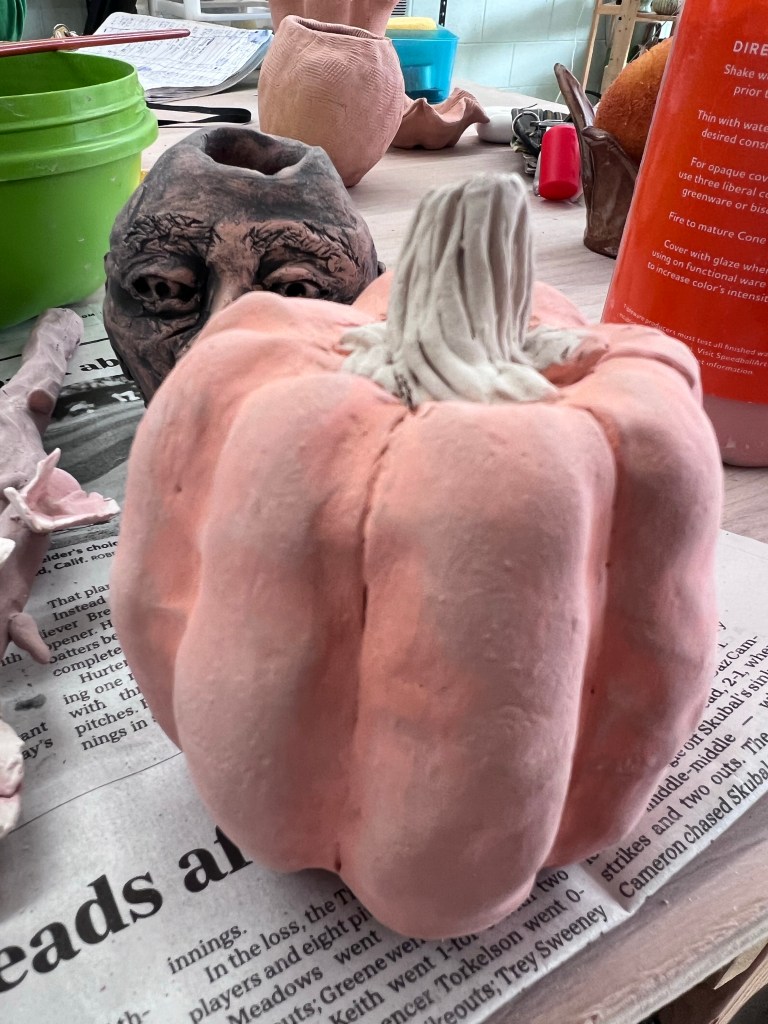 My pumpkin will be ready for Thanksgiving, even if it missed Halloween this year. And I glazed two of the texture vases I made a few weeks ago. I’m eager to see how they turn out.